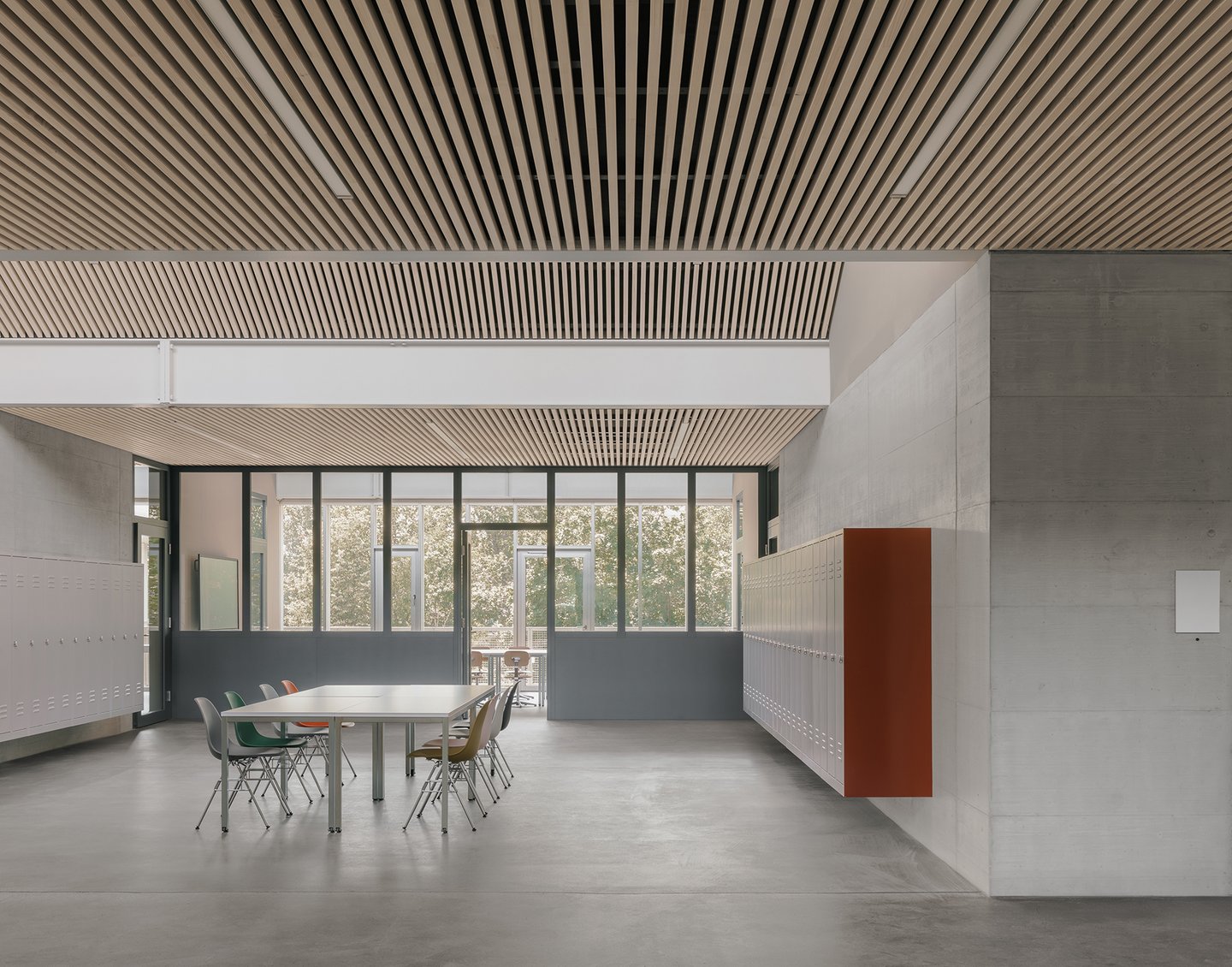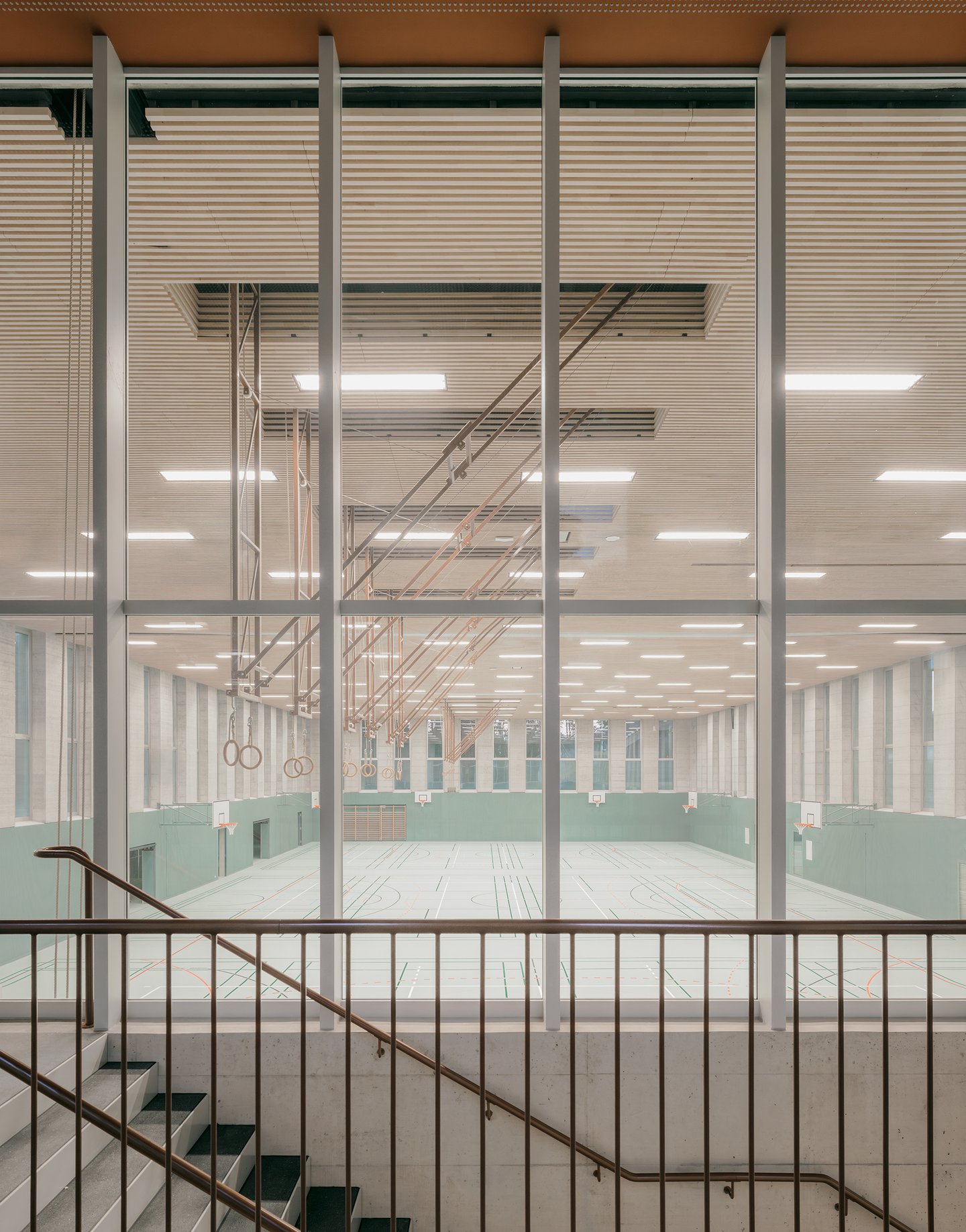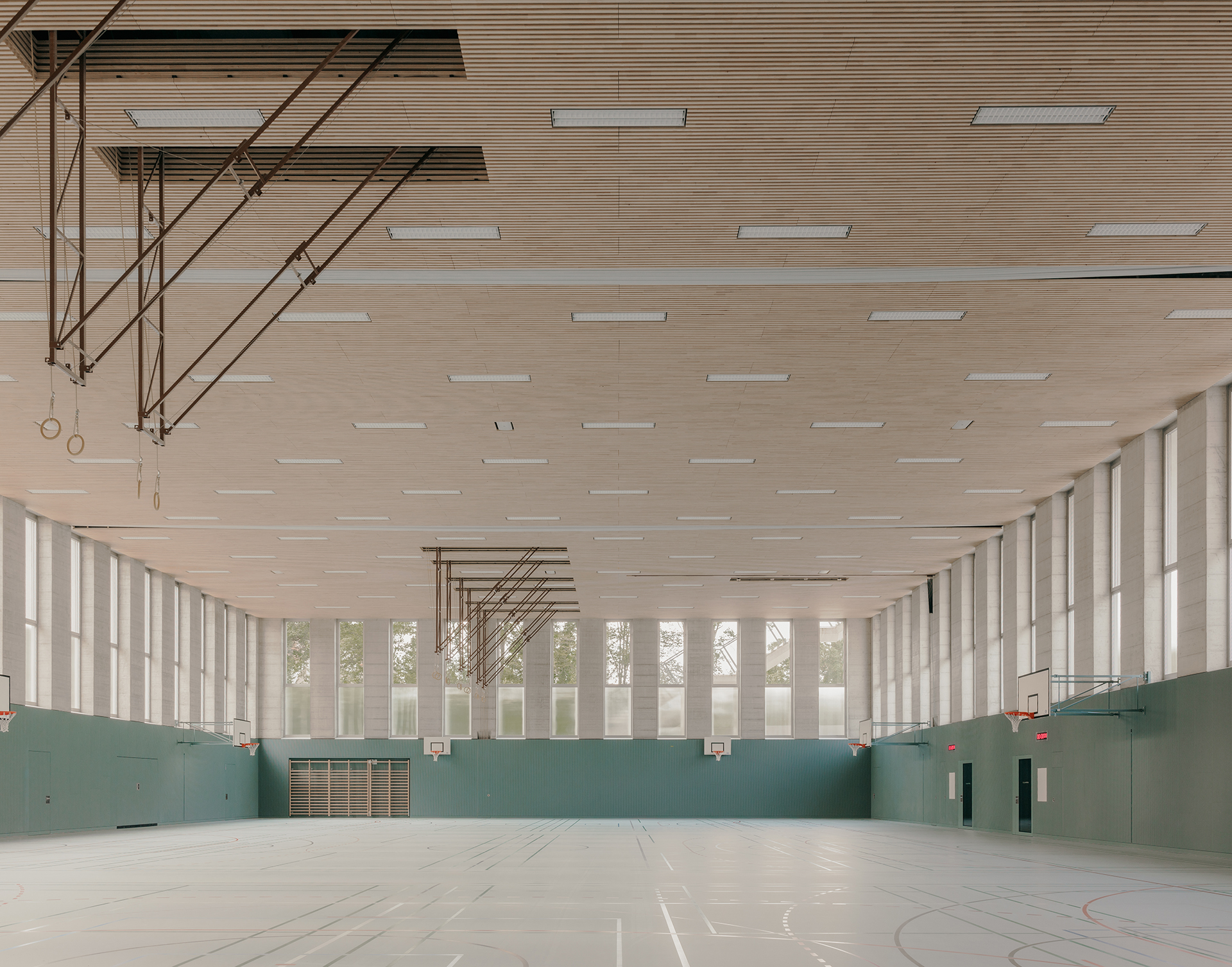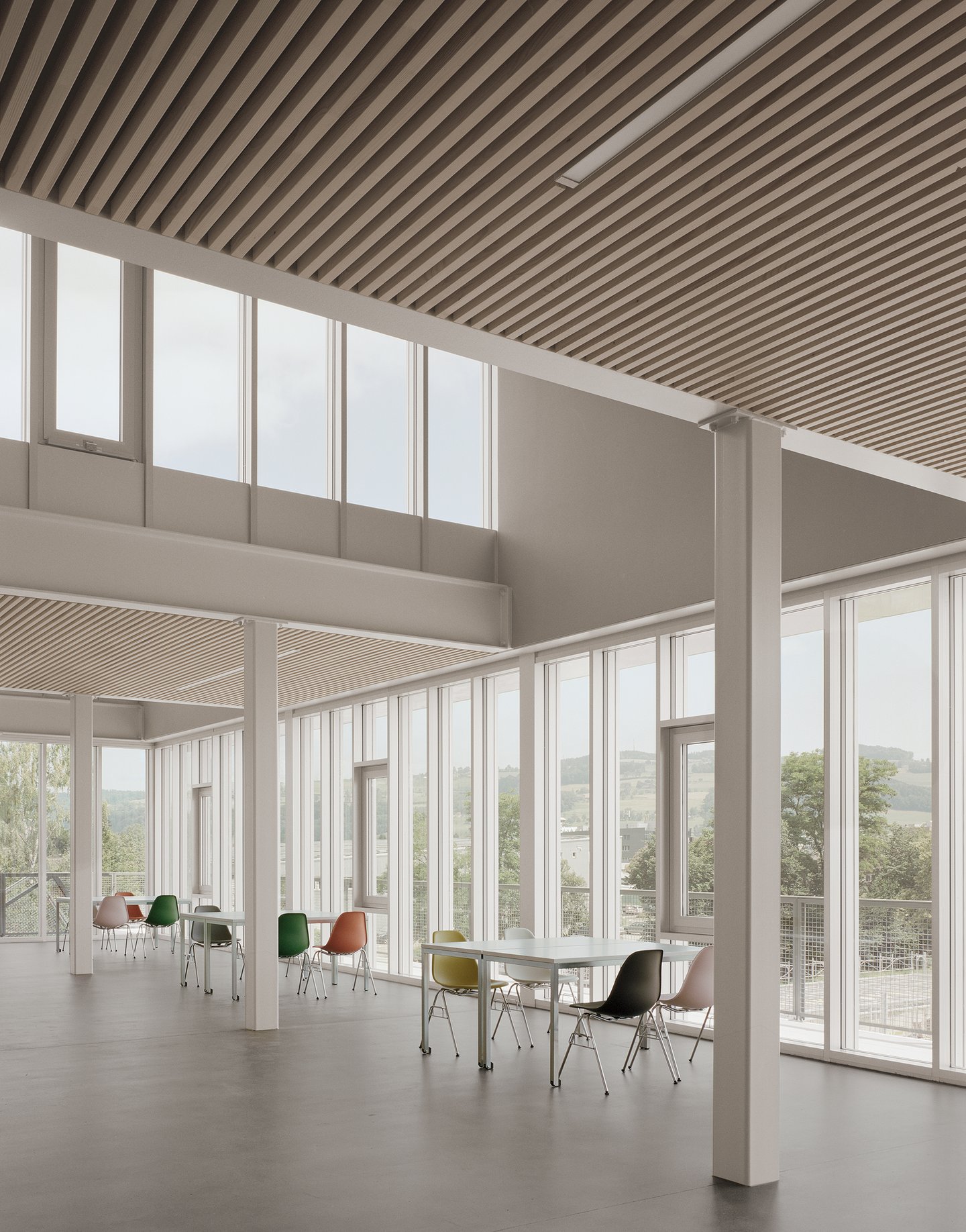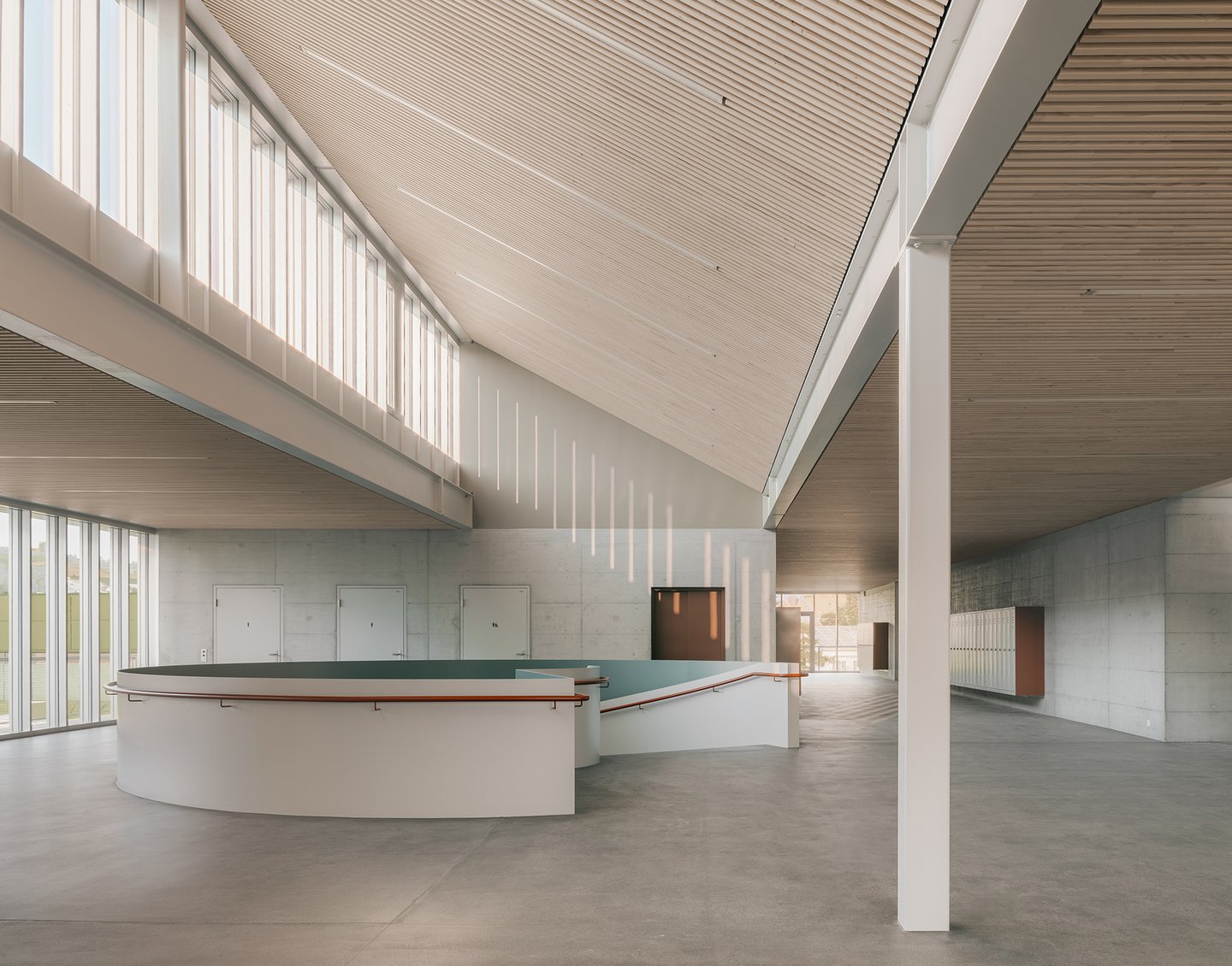Das Erdgeschoss ist geprägt durch die doppelgeschossige Eingangshalle und durch den Luftraum der Sporthalle, die eine Sichtbeziehung zwischen dem Flussraum und dem Allwetterplatz schafft. Alle Klassenzimmer sind auf einer Ebene im Dachgeschoss organisiert. Der gesamte Raum ist durch alternierende sheddach-artige Oberlichter und flache Decken gegliedert. Sowohl die Unterrichtsräume wie auch die Erschliessungszonen profitieren vom sanften, nordseitigen Tageslicht. So ist ein räumliches Kontinuum entstanden, eine Art Lernatelier, das sich dank einer klaren Tragstruktur nach Bedarf neu organisieren lässt. Klassenzimmer und Gruppenräume können zusammengeschlossen werden und diverse Unterrichtsformen beherbergen. Als Teil des Erschliessungbereichs, aber trotzdem klar abgetrennt, befinden sich zur Ostseite hin eine Reihe von Lernnischen, die viele Nutzungsmöglichkeiten bietet.