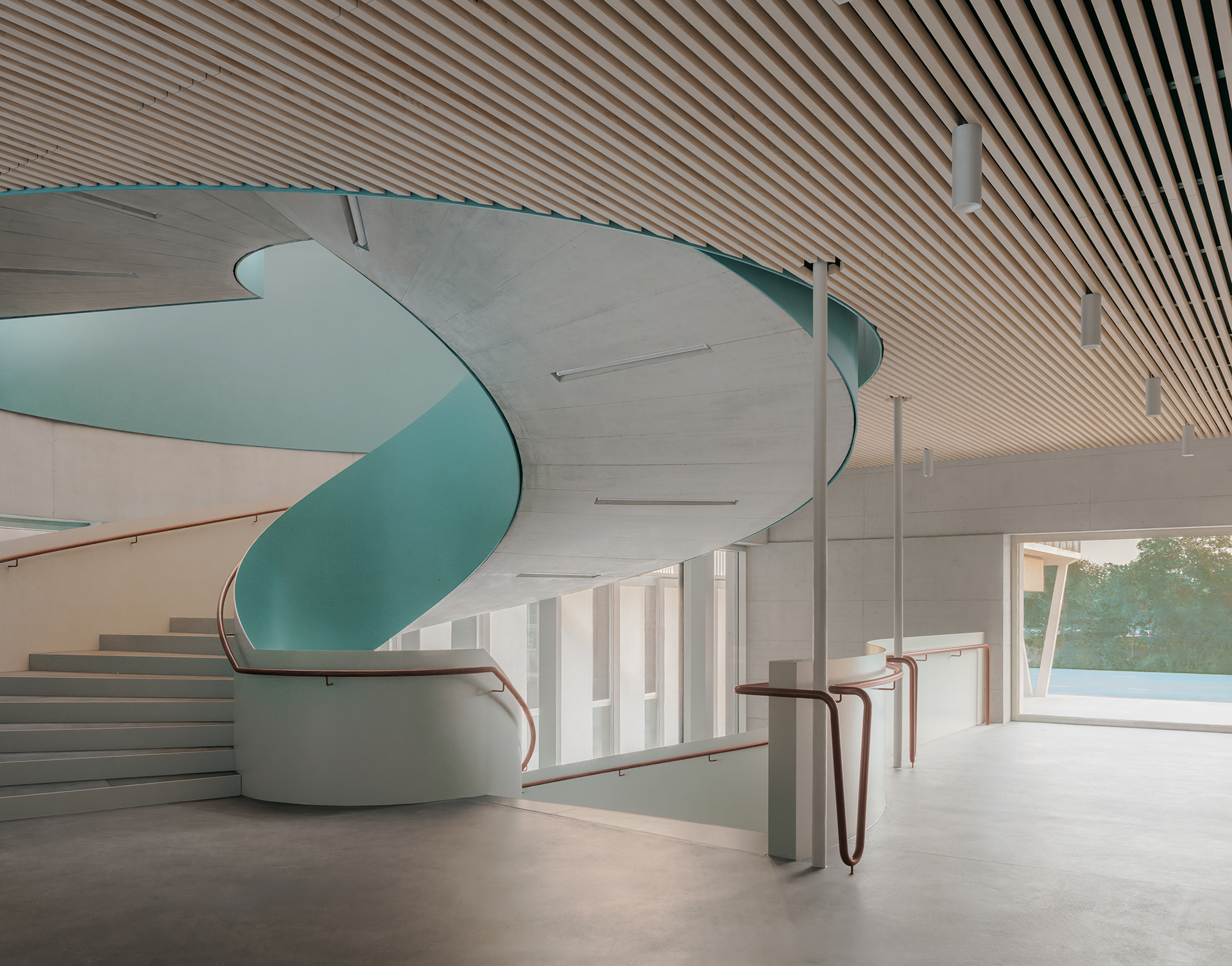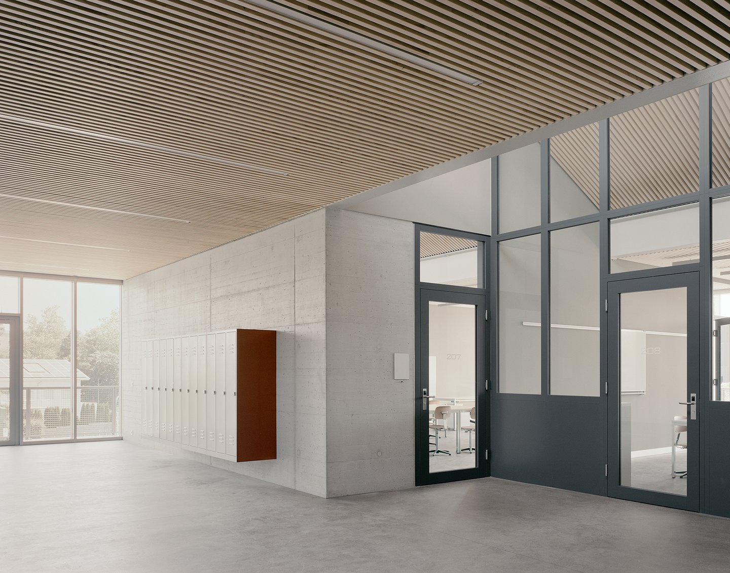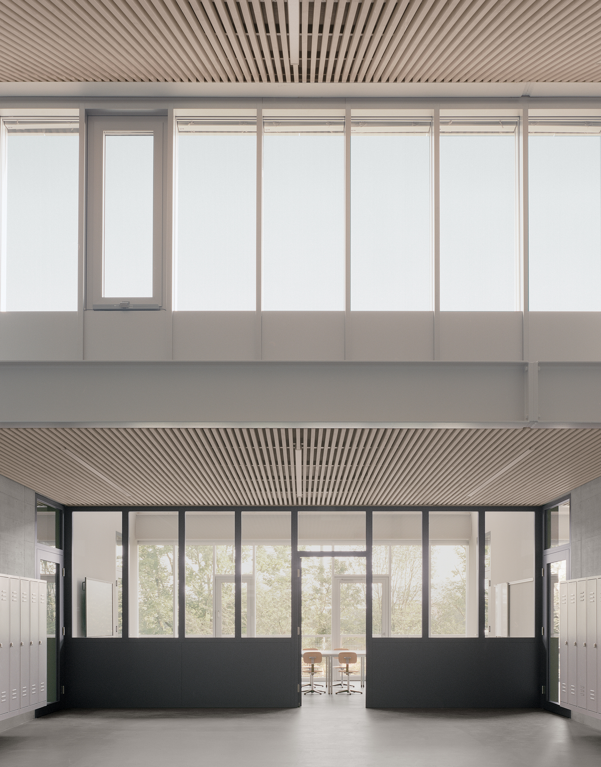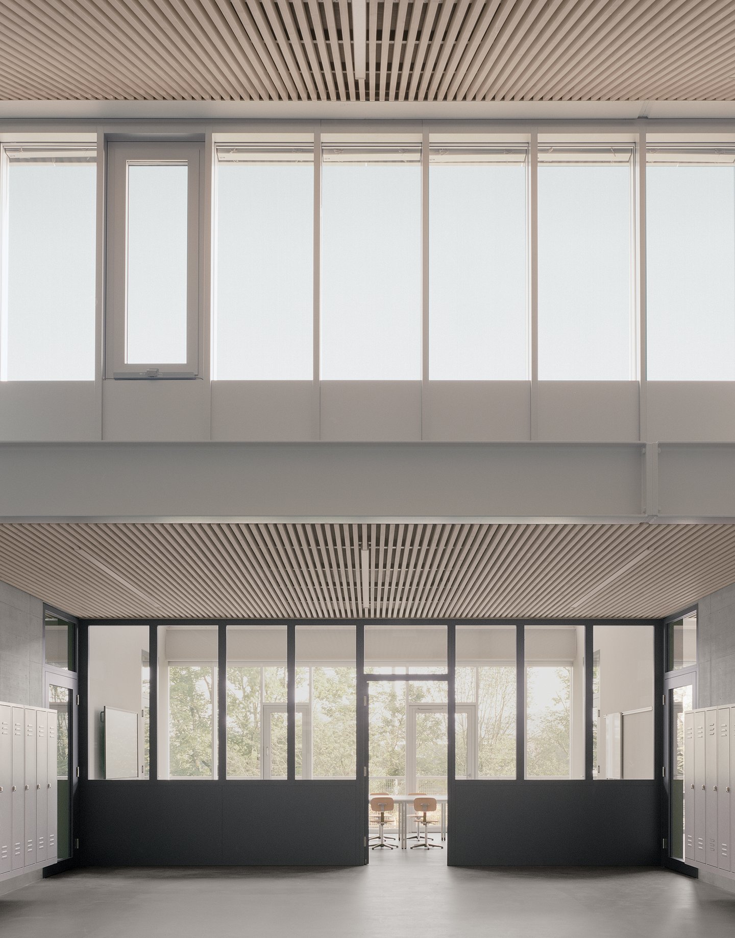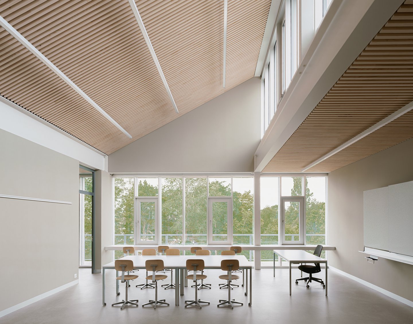 Das Erdgeschoss ist geprägt durch die doppelgeschossige Eingangshalle und durch den Luftraum der Sporthalle, die eine Sichtbeziehung zwischen dem Flussraum und dem Allwetterplatz schafft. Alle Klassenzimmer sind auf einer Ebene im Dachgeschoss organisiert. Der gesamte Raum ist durch alternierende sheddach-artige Oberlichter und flache Decken gegliedert. Sowohl die Unterrichtsräume wie auch die Erschliessungszonen profitieren vom sanften, nordseitigen Tageslicht. So ist ein räumliches Kontinuum entstanden, eine Art Lernatelier, das sich dank einer klaren Tragstruktur nach Bedarf neu organisieren lässt. Klassenzimmer und Gruppenräume können zusammengeschlossen werden und diverse Unterrichtsformen beherbergen. Als Teil des Erschliessungbereichs, aber trotzdem klar abgetrennt, befinden sich zur Ostseite hin eine Reihe von Lernnischen, die viele Nutzungsmöglichkeiten bietet.