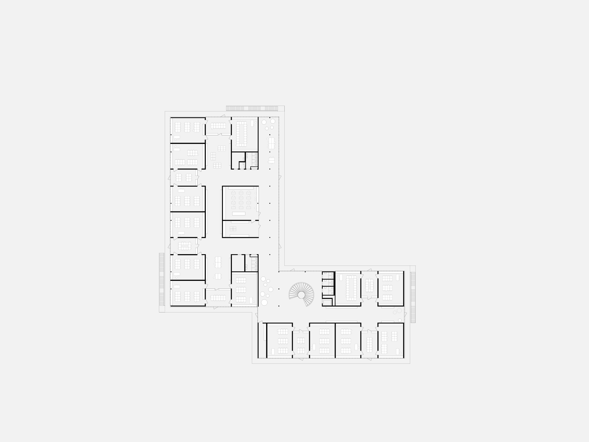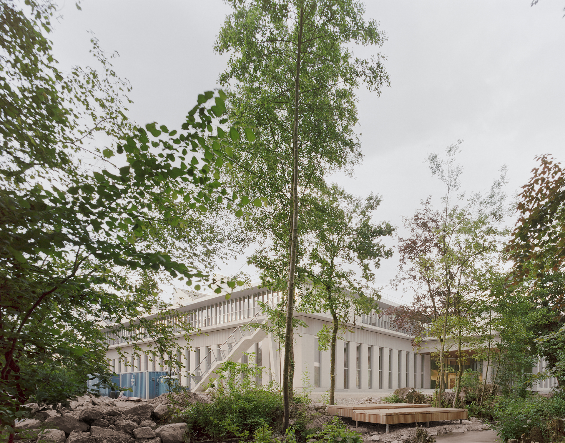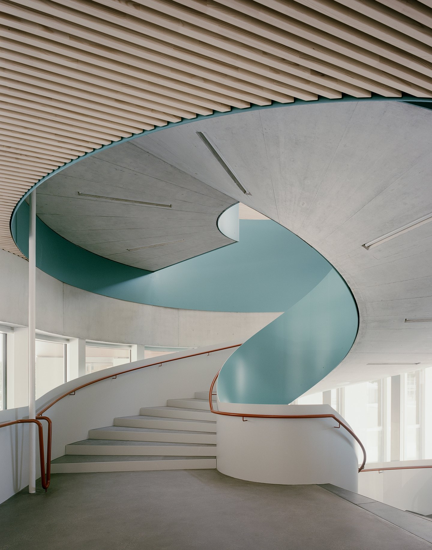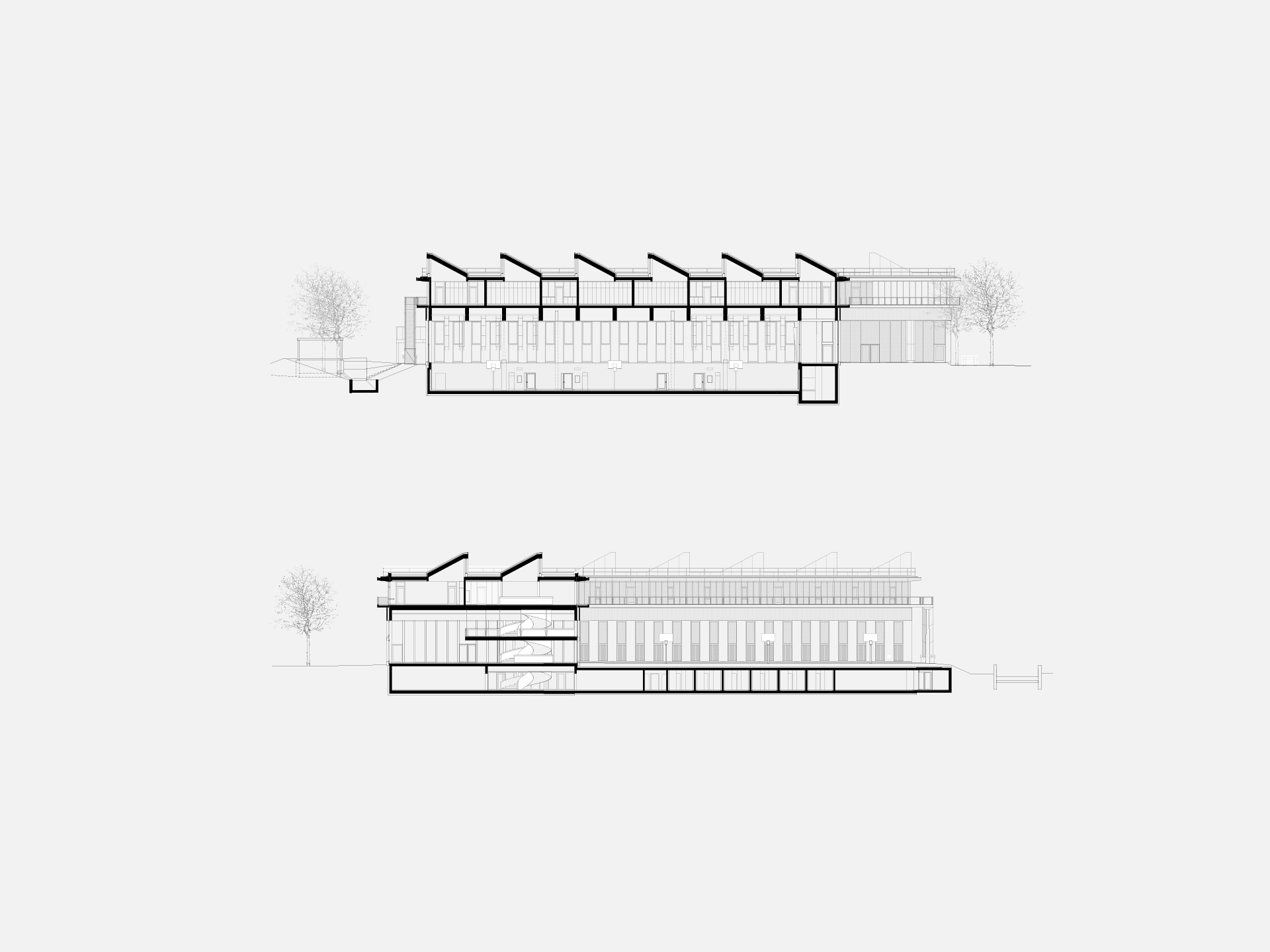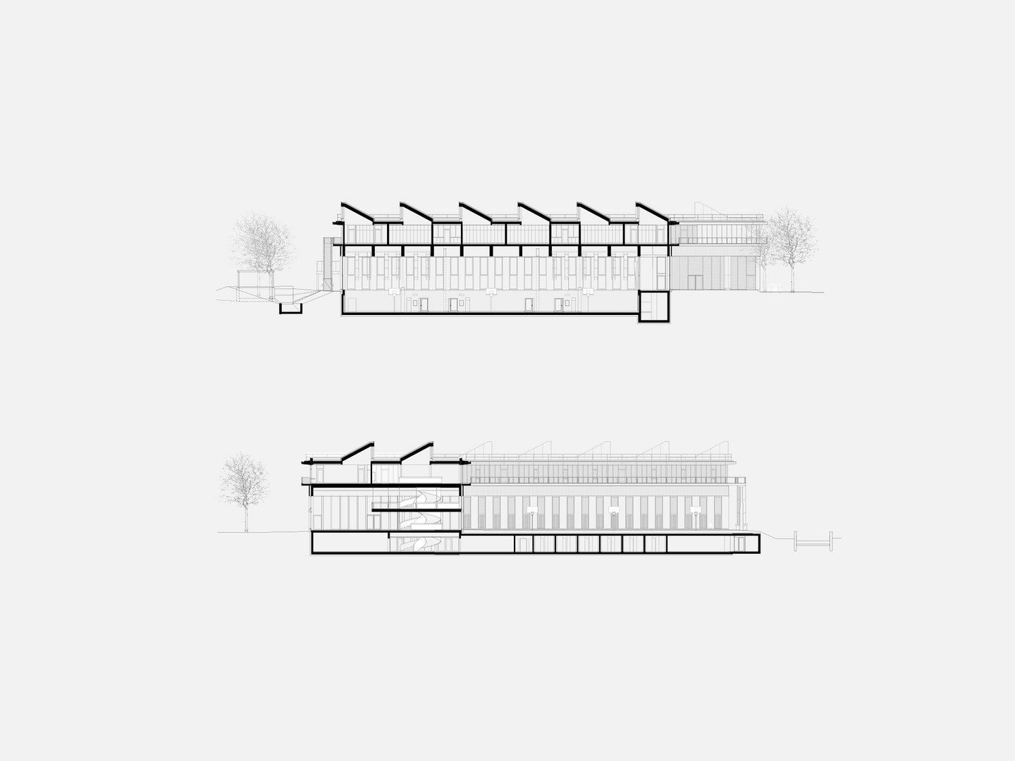 Das Erdgeschoss ist geprägt durch die doppelgeschossige Eingangshalle und durch den Luftraum der Sporthalle, die eine Sichtbeziehung zwischen dem Flussraum und dem Allwetterplatz schafft. Alle Klassenzimmer sind auf einer Ebene im Dachgeschoss organisiert. Der gesamte Raum ist durch alternierende sheddach-artige Oberlichter und flache Decken gegliedert. Sowohl die Unterrichtsräume wie auch die Erschliessungszonen profitieren vom sanften, nordseitigen Tageslicht. So ist ein räumliches Kontinuum entstanden, eine Art Lernatelier, das sich dank einer klaren Tragstruktur nach Bedarf neu organisieren lässt. Klassenzimmer und Gruppenräume können zusammengeschlossen werden und diverse Unterrichtsformen beherbergen. Als Teil des Erschliessungbereichs, aber trotzdem klar abgetrennt, befinden sich zur Ostseite hin eine Reihe von Lernnischen, die viele Nutzungsmöglichkeiten bietet.