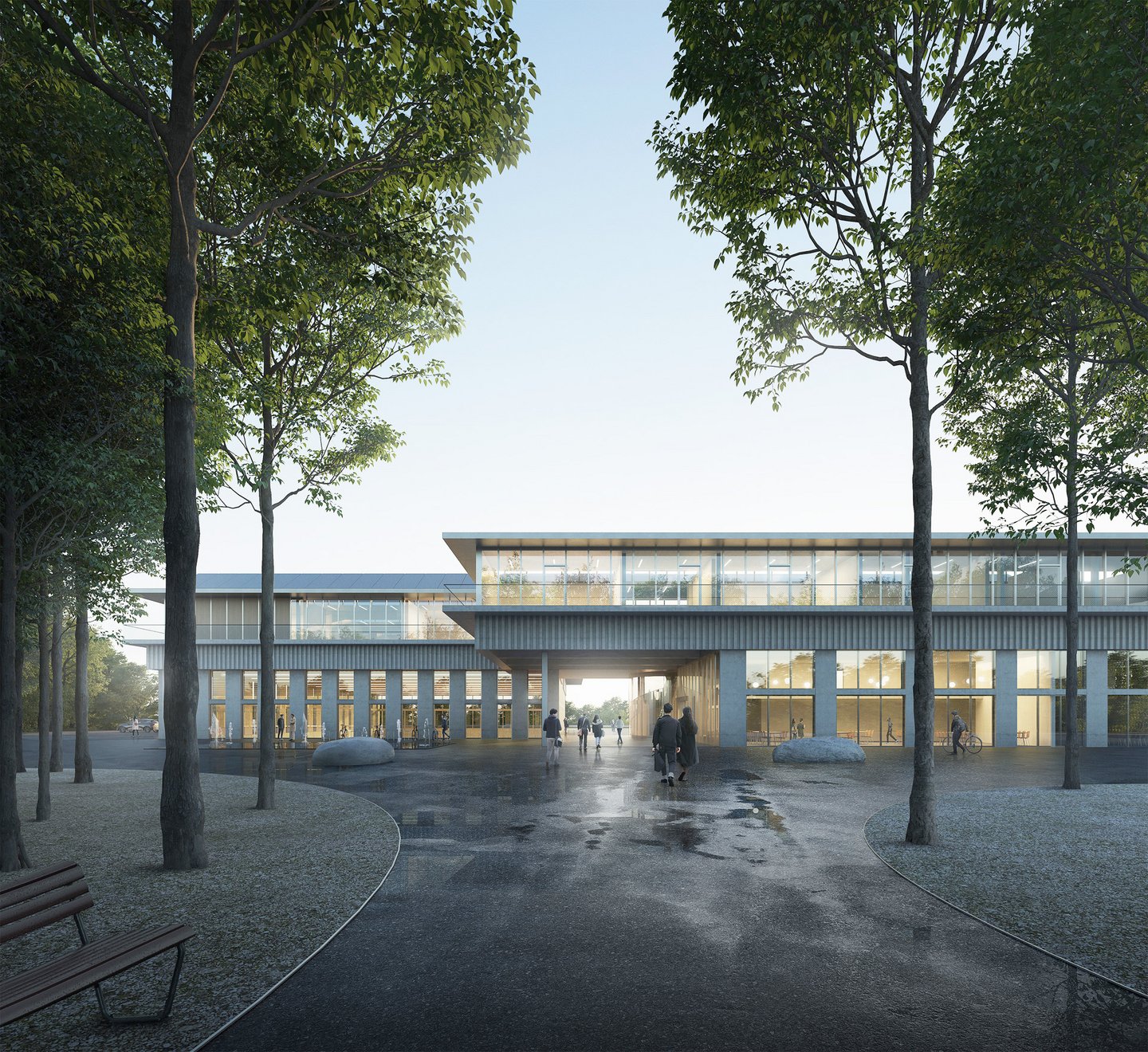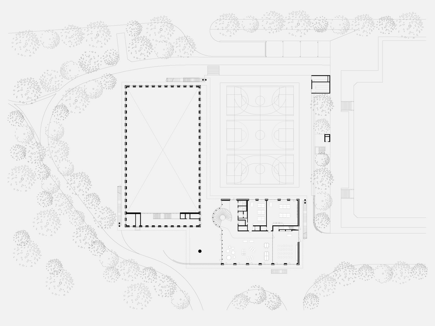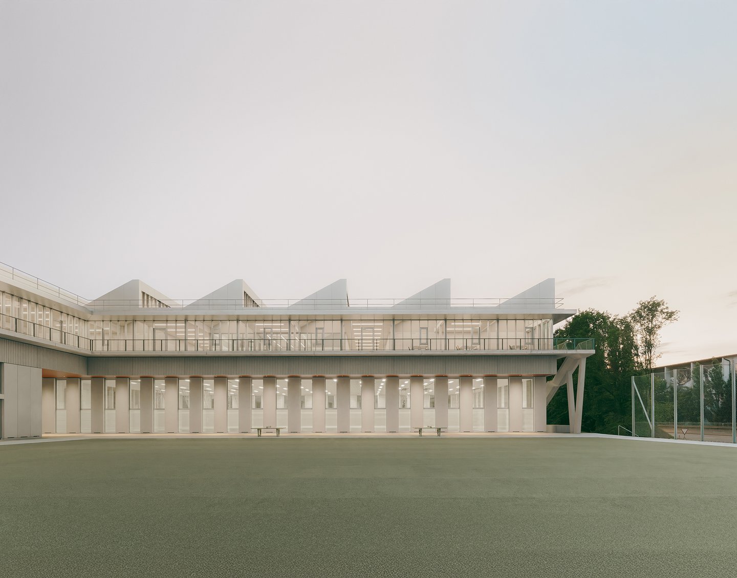 Zwei Gebäudeteile gliedern das Volumen in einen Sockelbereich und ein darüber liegendes schwebendes Dachgeschoss. Dazwischen liegt eine gedeckte Pausenhalle, welche den Pausenplatz im Süden mit dem Allwetterplatz im Norden verbindet.