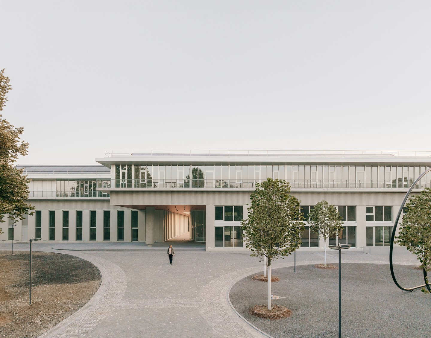 Die Gestaltung der Fassaden macht die räumliche Organisation sichtbar: Das Erdgeschoss und das 1. Obergeschoss sind durch Betonpfeiler und Fenster als Einheit konzipiert. Ein engerer Rhythmus bringt Tageslicht in die Sporthalle, ein offenerer Rhythmus verdeutlicht den Bezug der Eingangshalle zum Aussenraum. Ein umlaufendes, profiliertes Betonelement verbindet die zwei Gebäudeteile. Darüber liegt das durchgehende Klassenzimmergeschoss, eine Art leichte Krone mit hohen Fenstern.