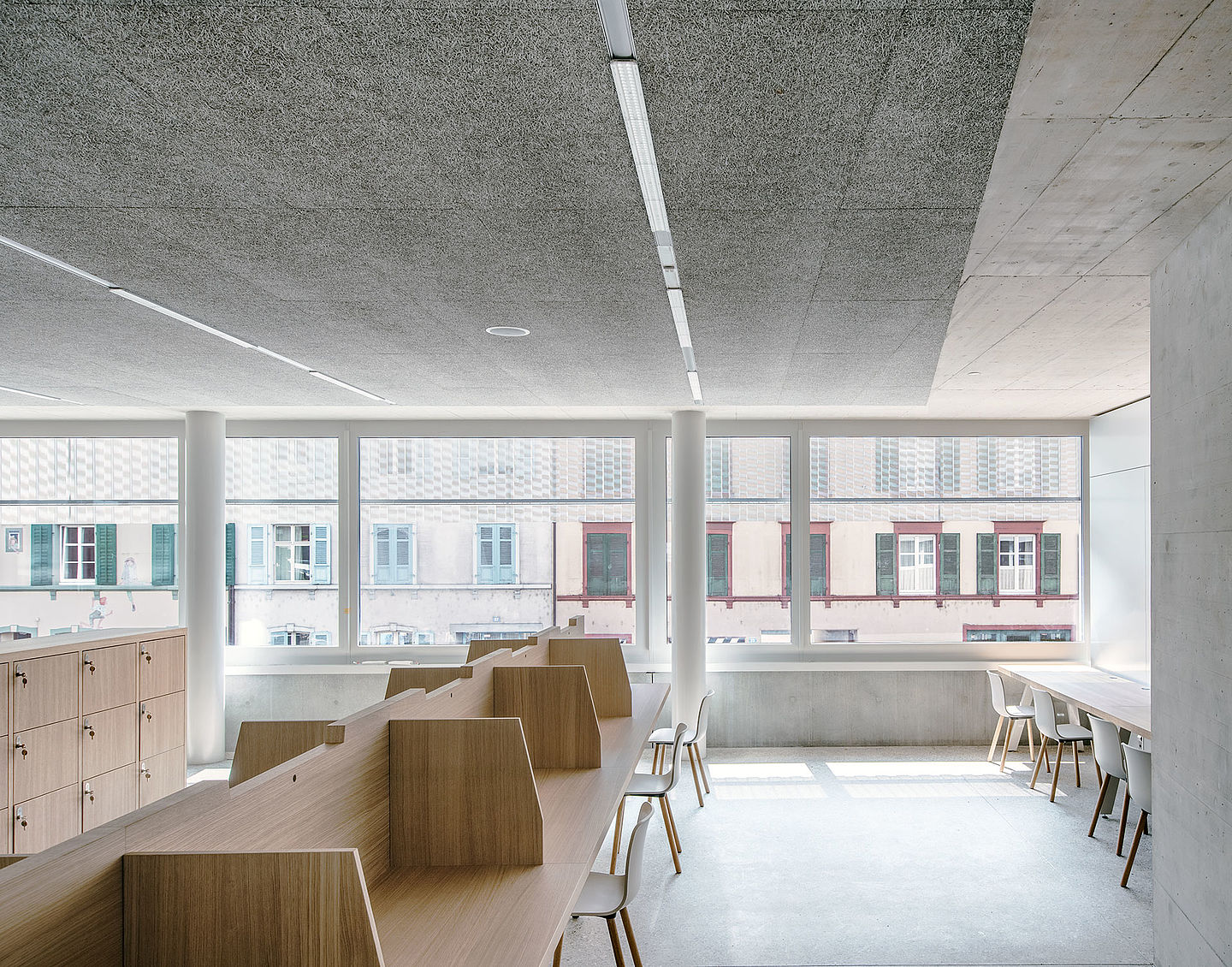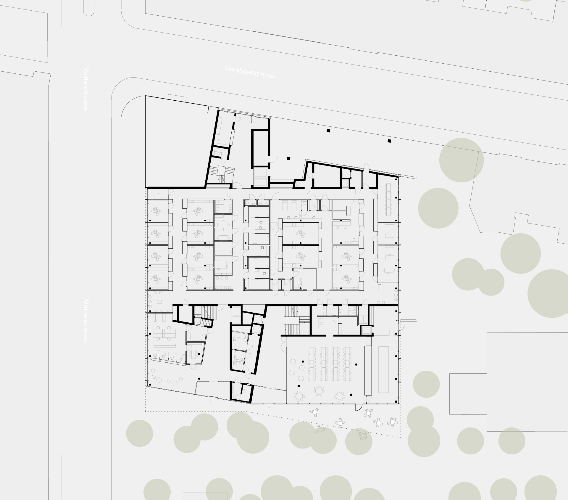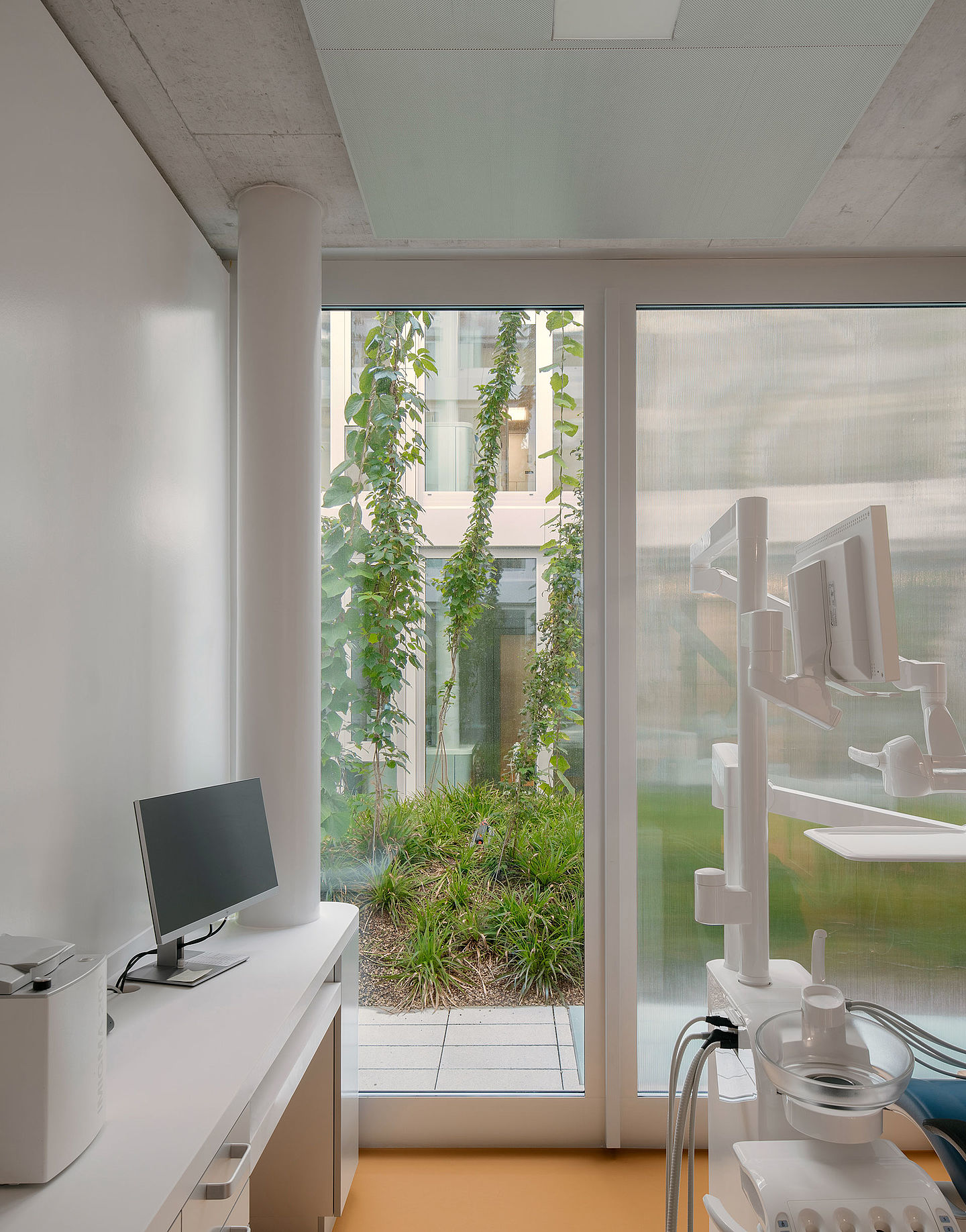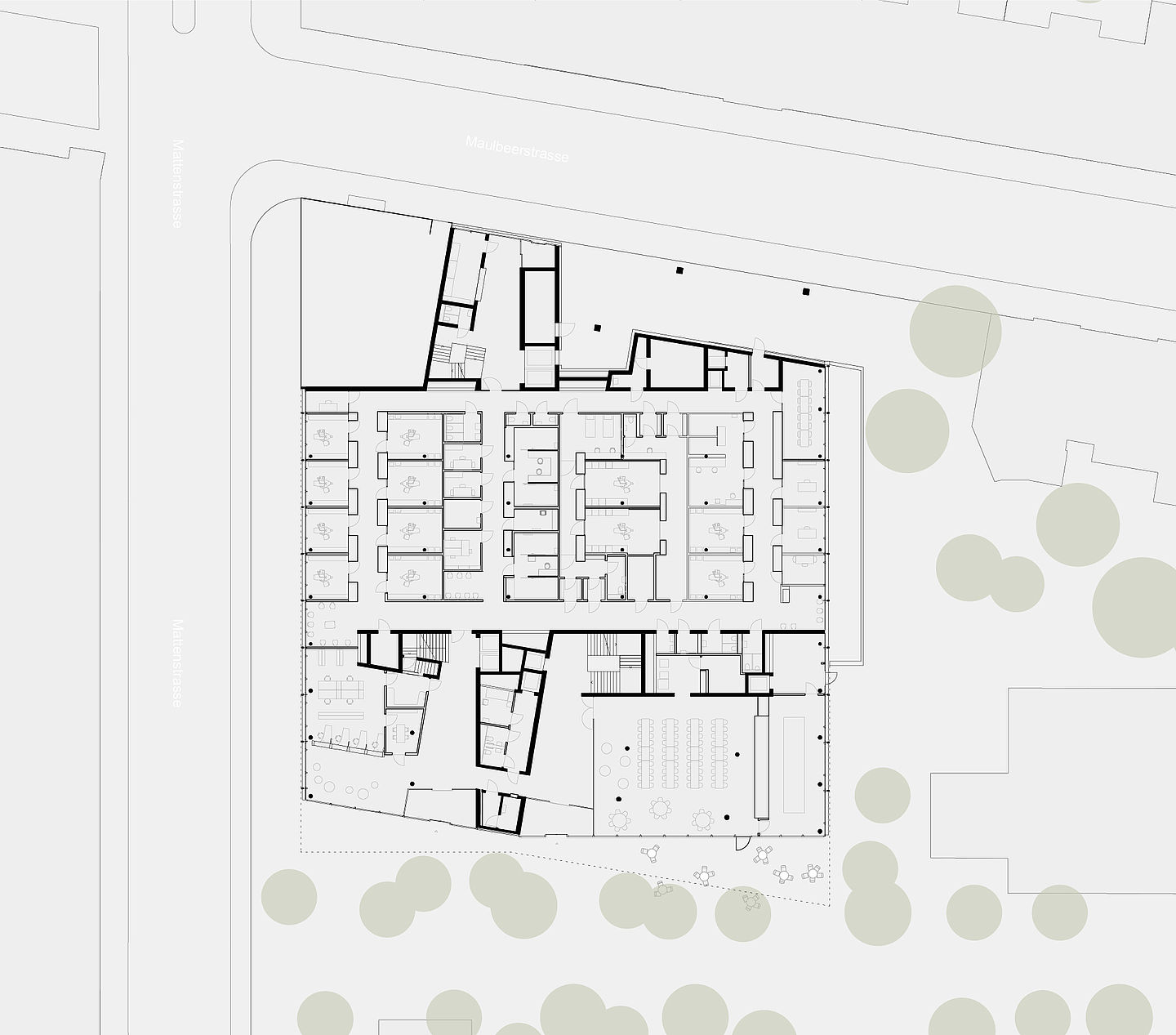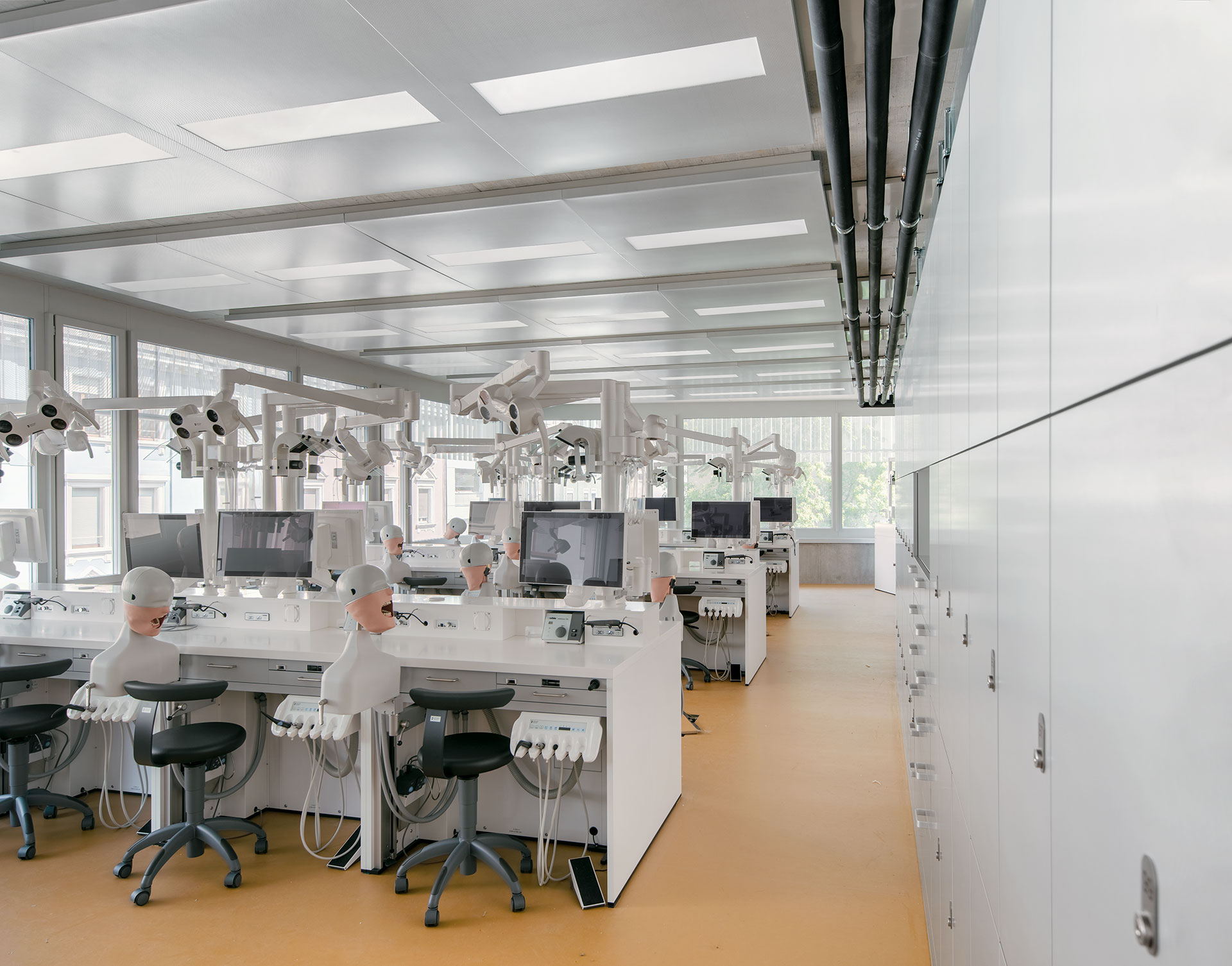Diese Teilung wiederspiegelt auch in der Nutzungsverteilung die Gebäudestruktur. Der Mittelteil mit den beiden Lichthöfen beinhaltet als kompakte Raumsequenz die Behandlungsräume sowie die Polyklinik, die Raumschicht entlang der Maulbeerstrasse wird mit Büroarbeitsplätze besetzt und der Kopf zum Eingangsraum als öffentlicher Teil beinhaltet die Bibliothek, die Seminarräume, den Hörsaal sowie die Labors.