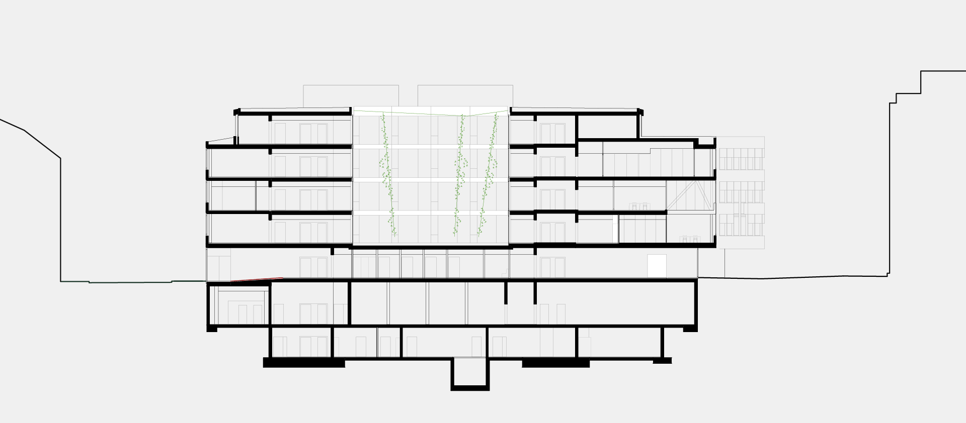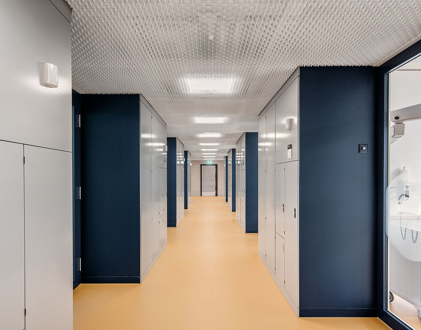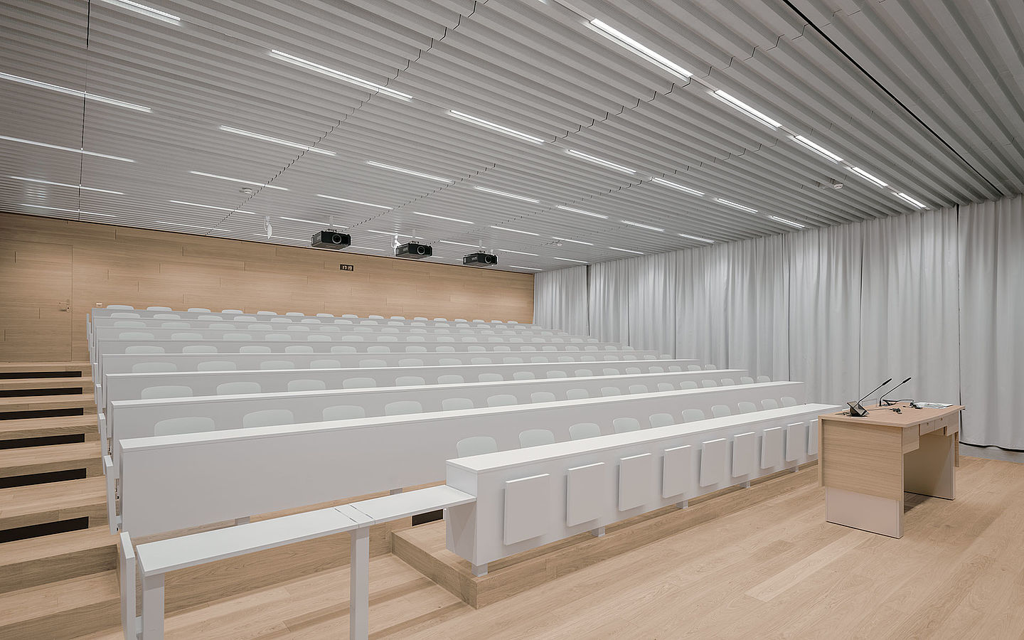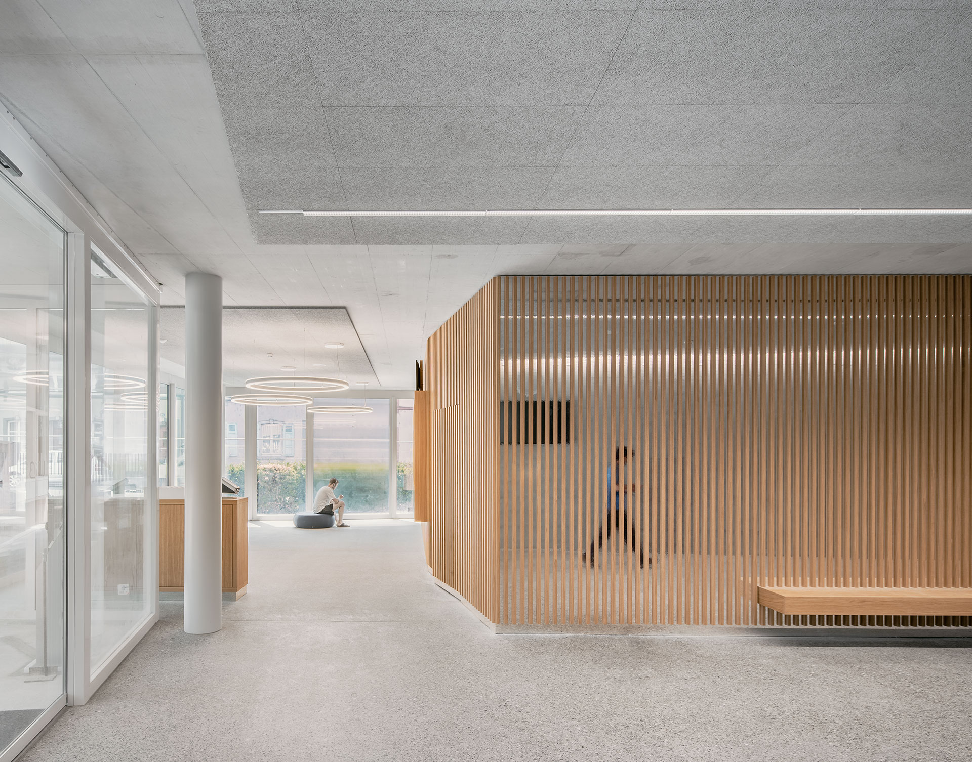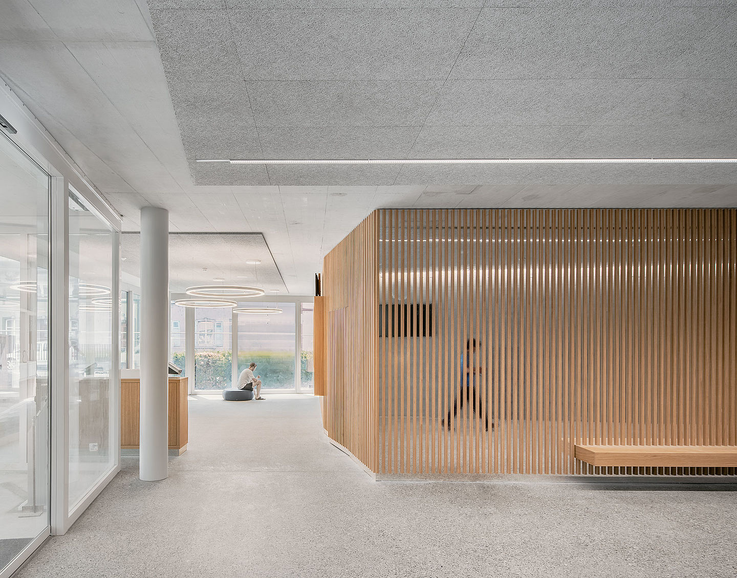 Diese Teilung wiederspiegelt auch in der Nutzungsverteilung die Gebäudestruktur. Der Mittelteil mit den beiden Lichthöfen beinhaltet als kompakte Raumsequenz die Behandlungsräume sowie die Polyklinik, die Raumschicht entlang der Maulbeerstrasse wird mit Büroarbeitsplätze besetzt und der Kopf zum Eingangsraum als öffentlicher Teil beinhaltet die Bibliothek, die Seminarräume, den Hörsaal sowie die Labors.