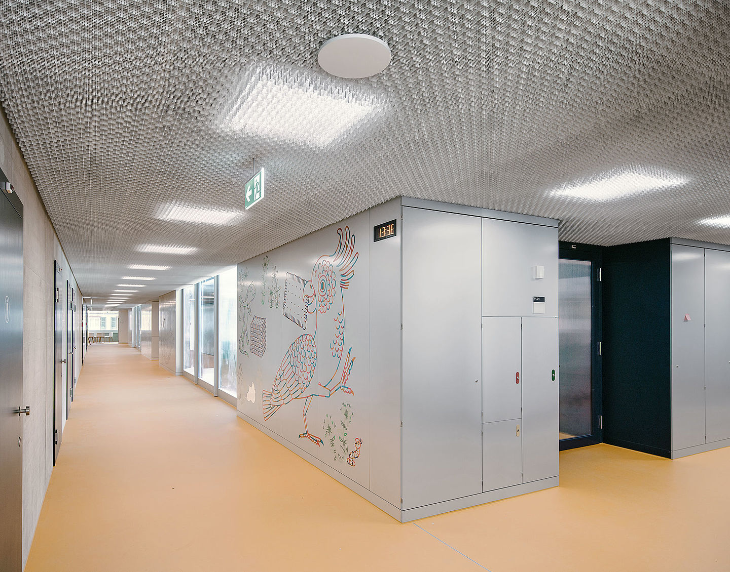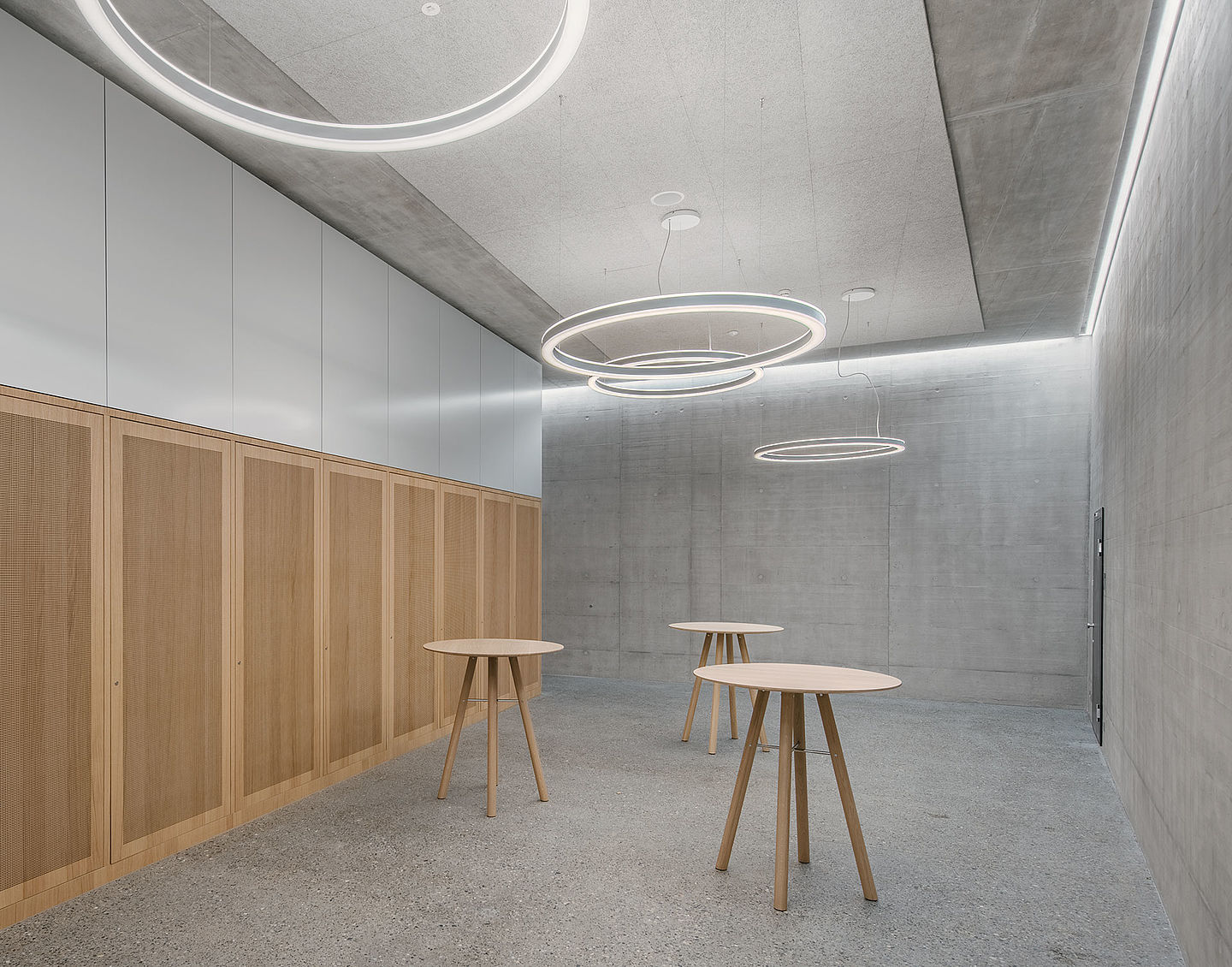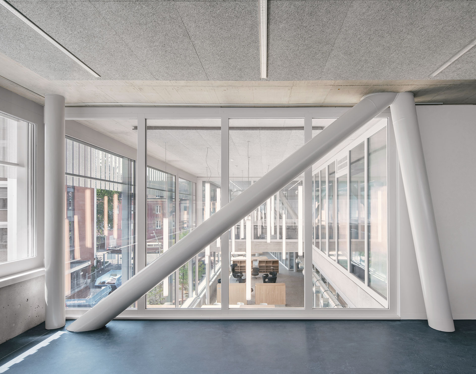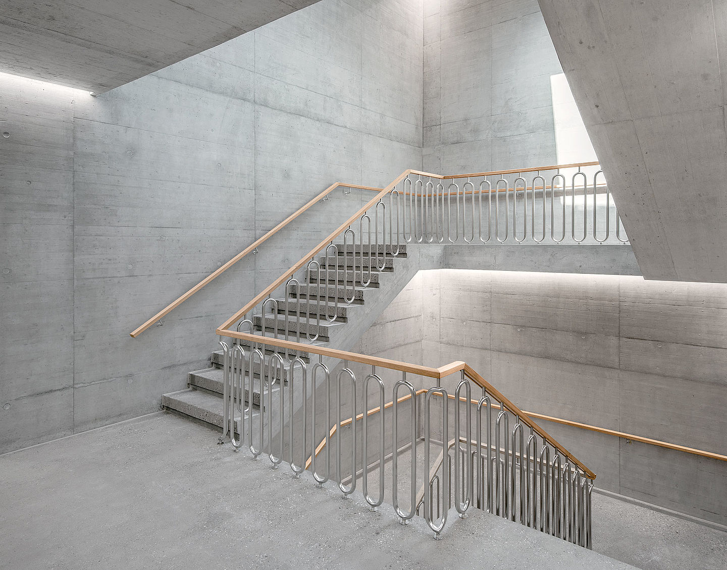 Durch die umlaufenden horizontalen Betonbänder schafft der Bau sowohl eine Anbindung an die vorwiegend horizontale Gliederung der chemischen Industrie als auch an die quartiertypischen Fassaden der Wohnhäuser. Die alternierend eingesetzten Verglasungen zwischen den massiven Brüstungen werden durch den Einsatz von perforiertem Trapezblech zusätzlich gegliedert und verbinden sich mit den mineralischen Betonbändern zu einer „massiven“ Einheit.