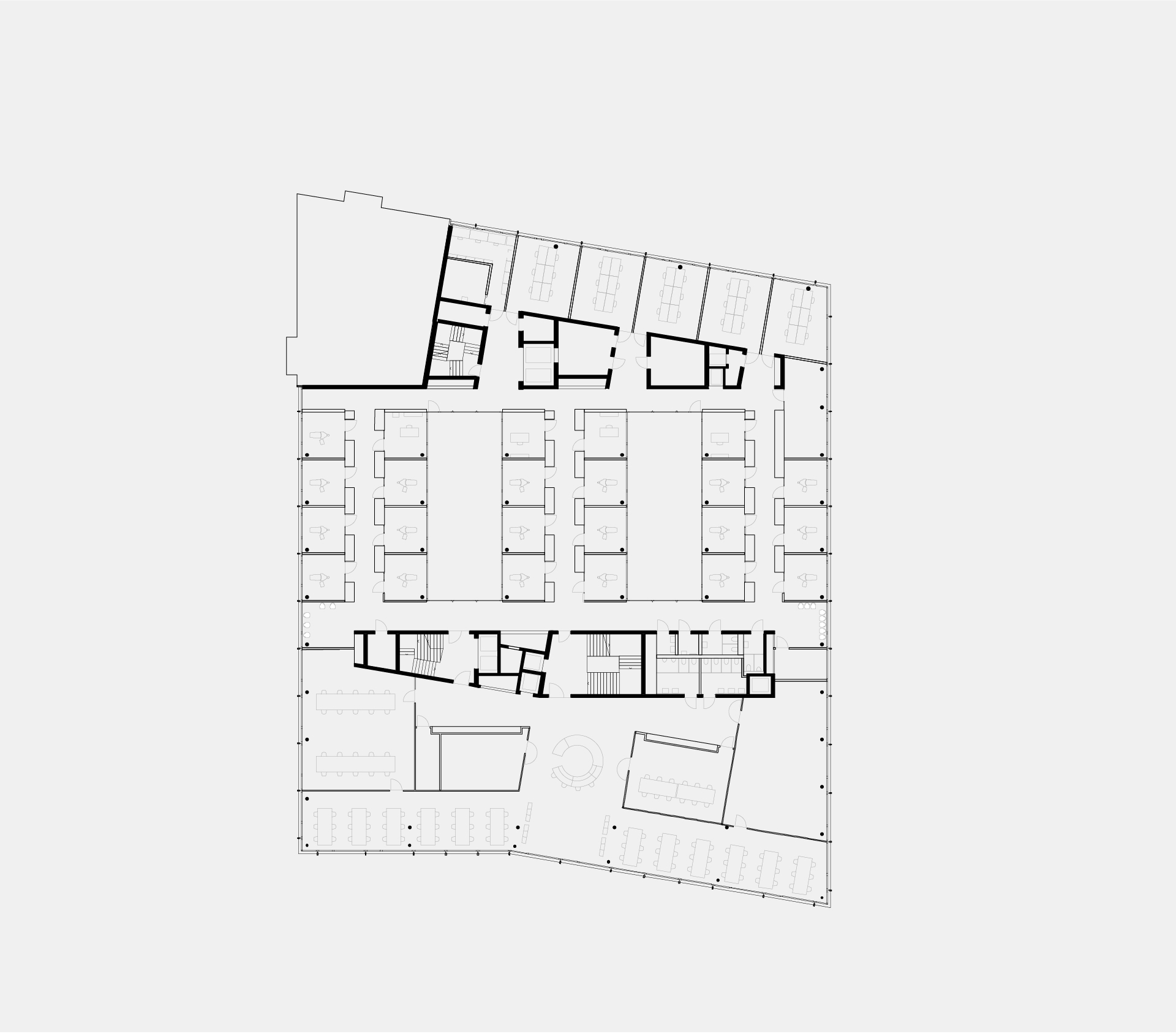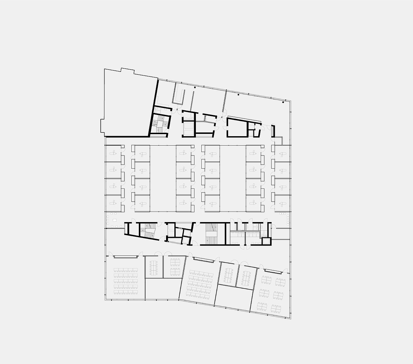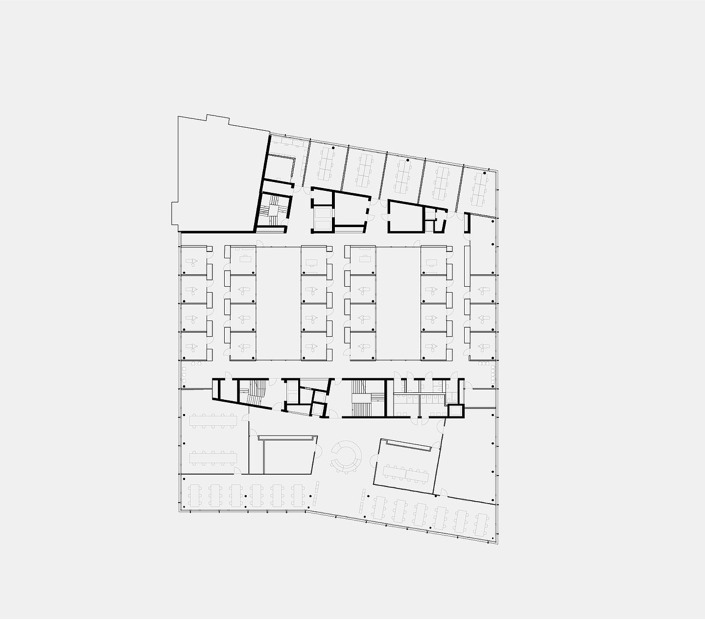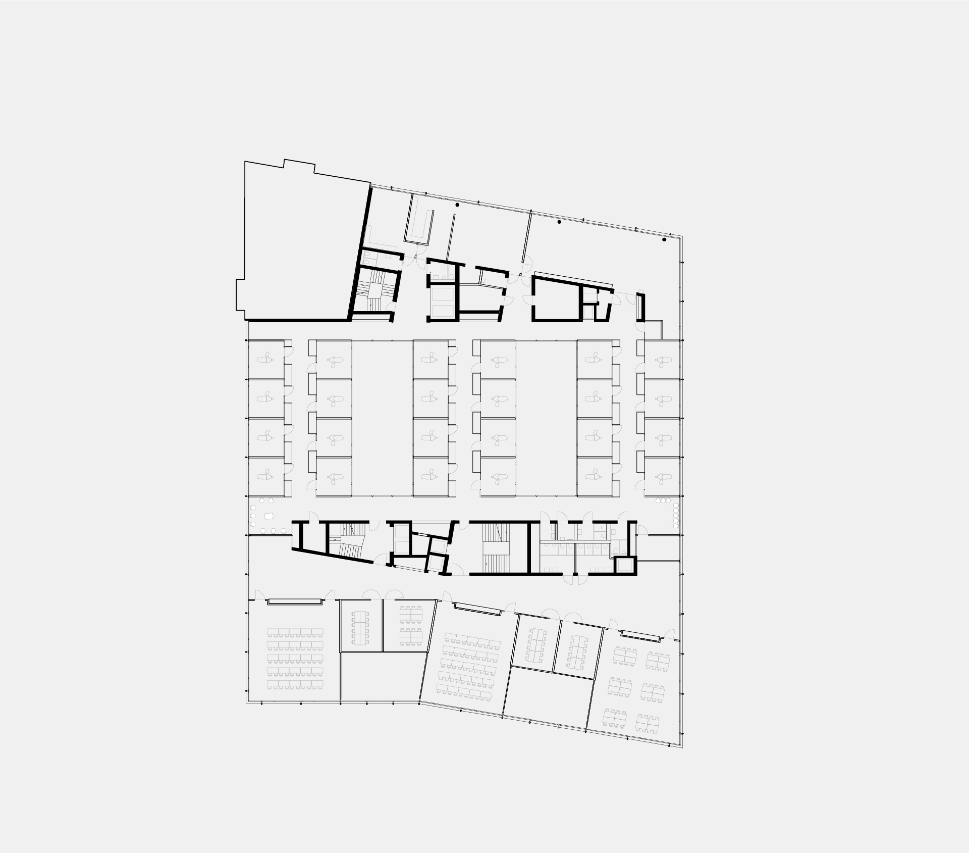 Die drei Zonen werden jeweils durch Kerne getrennt, welche die vertikale Erschliessung sowie die installationsintensiven Räume beinhalten.
