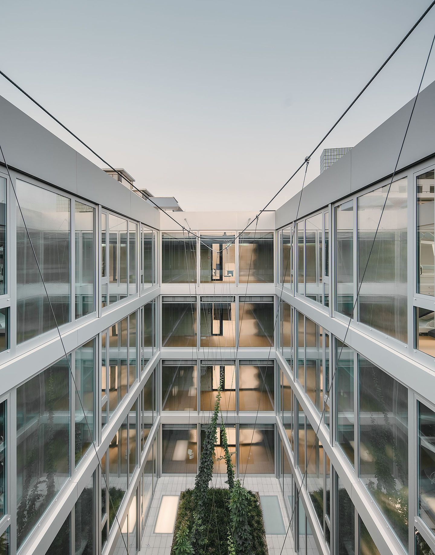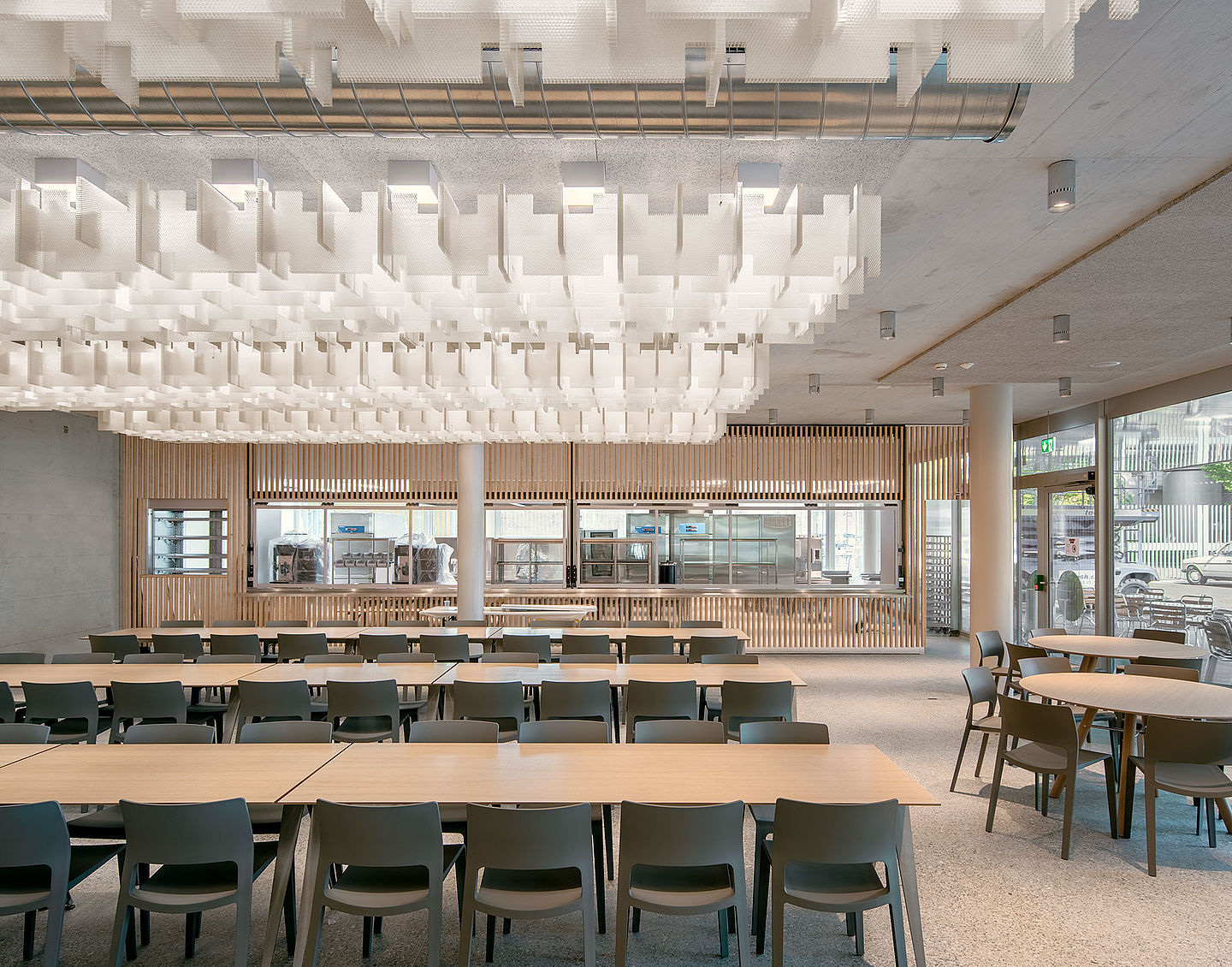 Entlang den Strassen werden die Fluchten respektiert und die Quartierdimension berücksichtigt, im Arealinnern wird im Gegensatz dazu der geschlossene Strassenkorridor aufgebrochen und das konventionelle Stadtvokabular von Strasse und Platz verlassen. Ein Raumtrichter schafft einen autonomen Stadtraum mit spezifischer Beziehung zu den Gebäudegruppen und bildet einen Anfang der zukünftigen Raumsequenz und identitätsstiftender Ort für den Campus Rosental. Zwei Hofräume und zwei statische Kerne gliedern das Volumen in drei Zonen. Die geknickte, südorientierte Seite zum Eingangsraum, ein Mittelteil welcher sich um die beiden Höfe gruppiert und der rückseitige Bereich zur Maulbeerstrasse mit der Anlieferung.