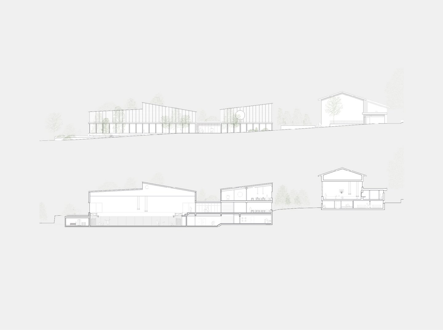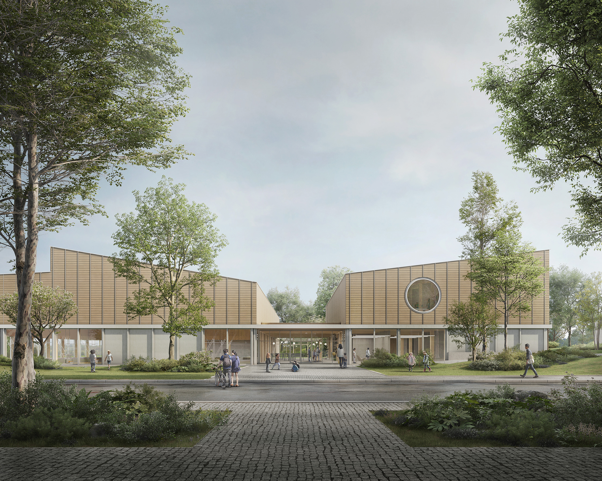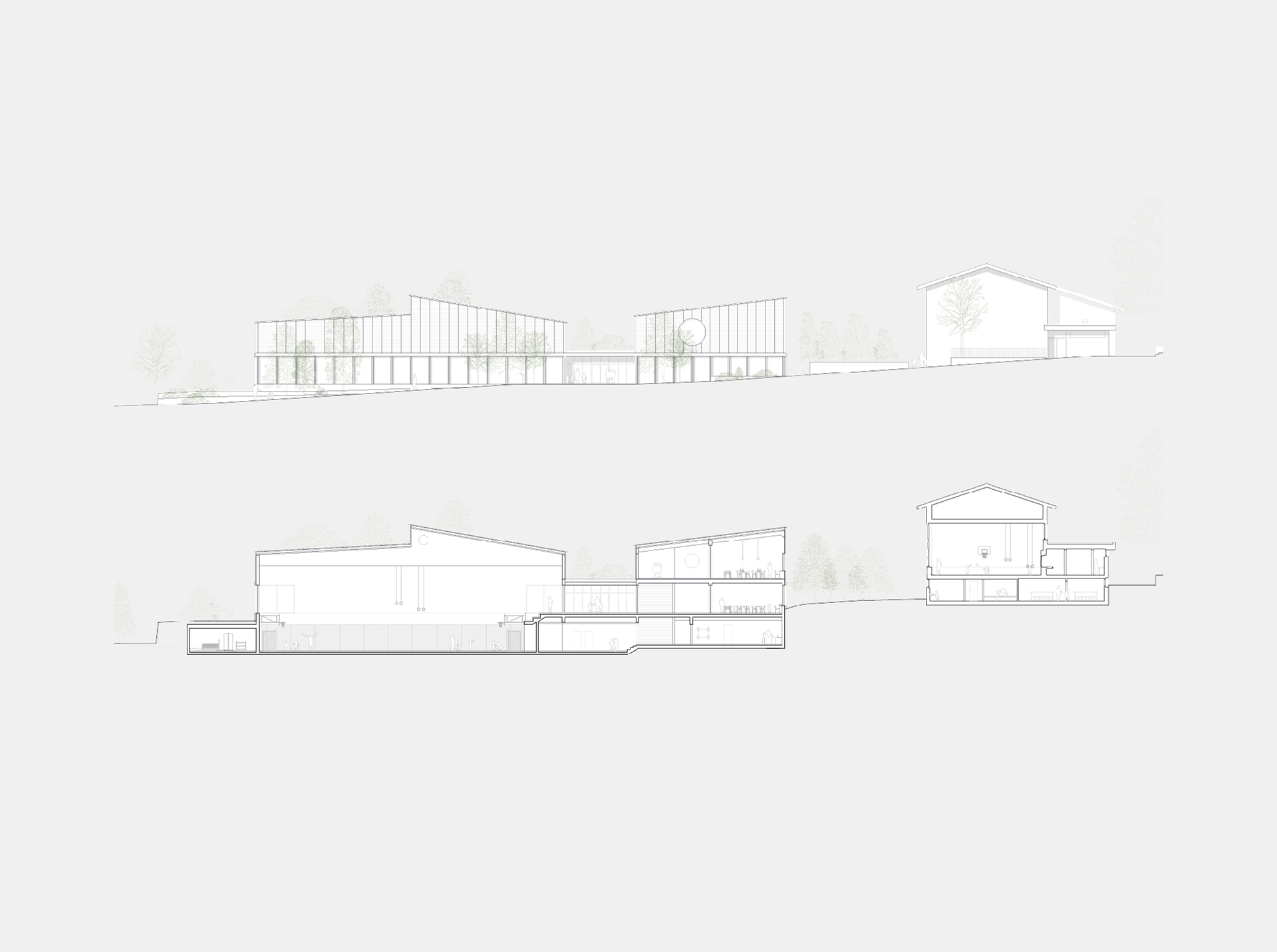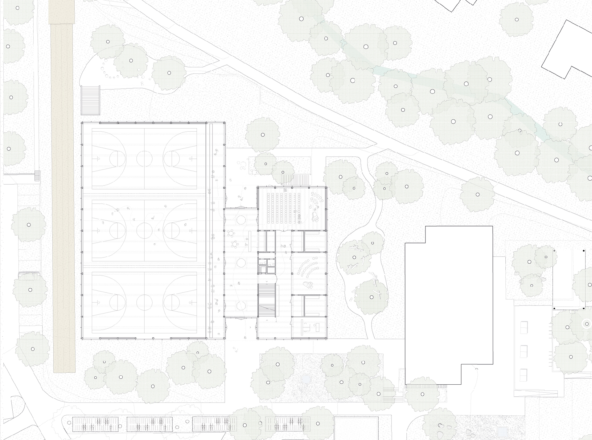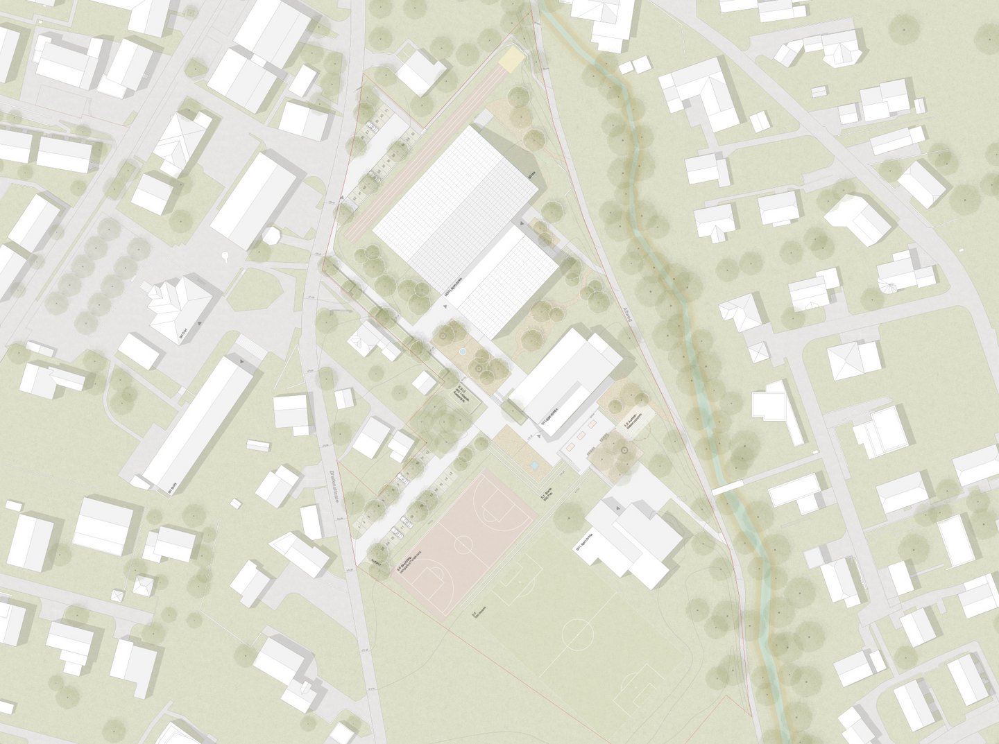 Der Neubau besteht aus drei Gebäudeteilen; die grosse Halle mit Tribüne, die Mehrzweckräume für Vereine mit den ergänzenden Räumen für den Schulbetrieb, sowie den mittigen Verbindungsbau. Dadurch entsteht ein massstäblicher Bezug zu den umliegenden Bauten und die einzelnen Gebäudeteile werden als identitätsstiftende Einheiten erlbebbar gemacht.