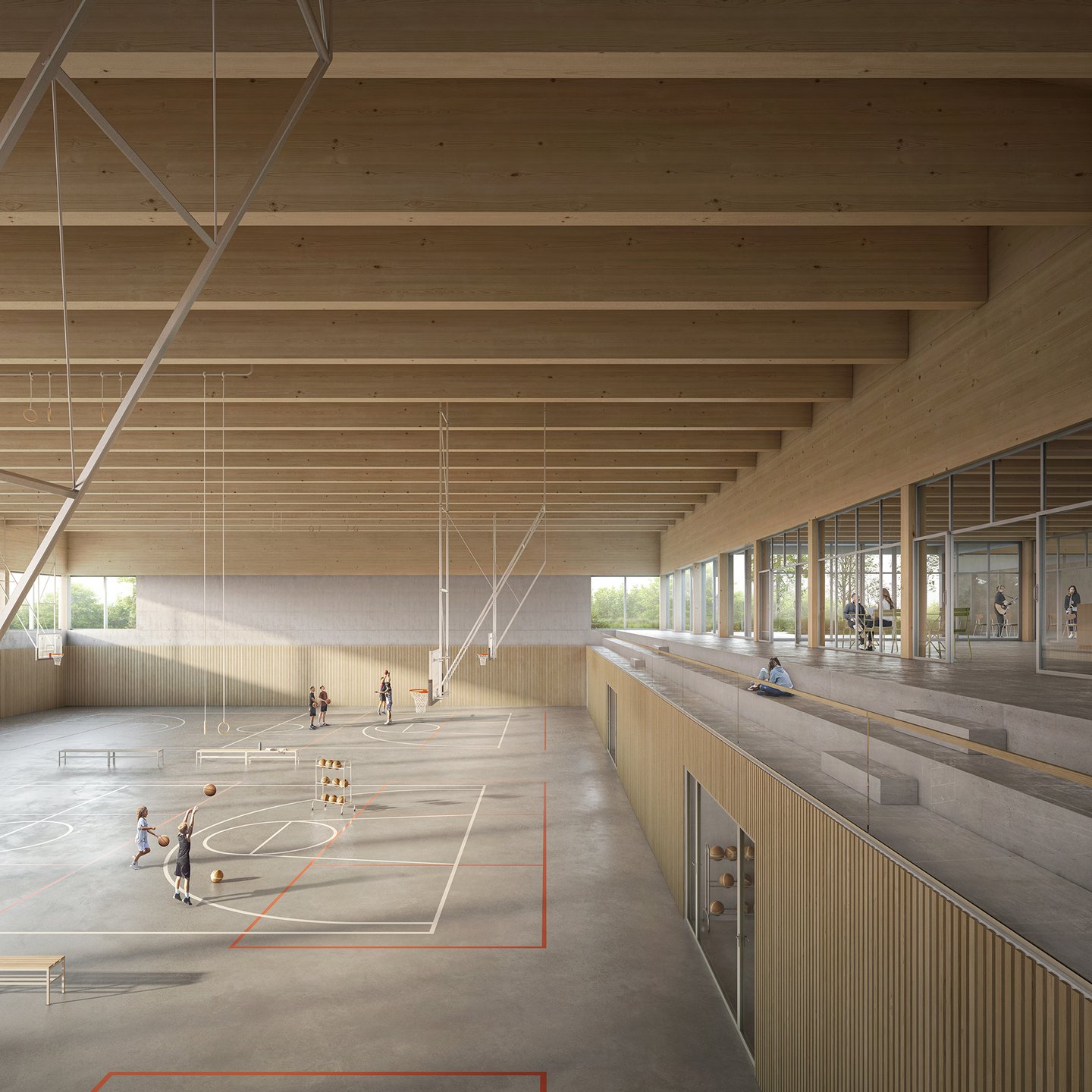 Konstruktion, Tragwerkskonzept / Die Sporthalle wird mit Bindern aus Brettschichtholz überspannt, deren Höhe unter Berücksichtigung der Dachform optimiert ist. Mit Längsträgern an den Fassaden kann ein grosszügiger Abstand der Holzstützen erreicht werden, zwischen denen in ausgewählten Achsen aussteifende Verbände aus Stahlseilen angeordnet werden. Zur Stabilisierung der Dachfläche dienen schubsteif untereinander verbundene Holzkastenelemente mit integrierter Wärmedämmung. Auch beim Schultrakt besteht die Tragkonstruktion über Terrain in analoger Bauweise aus Holz, wobei mit einer mittleren Stützenachse wirtschaftliche Spannweiten in Querrichtung des Traktes vorhanden sind.