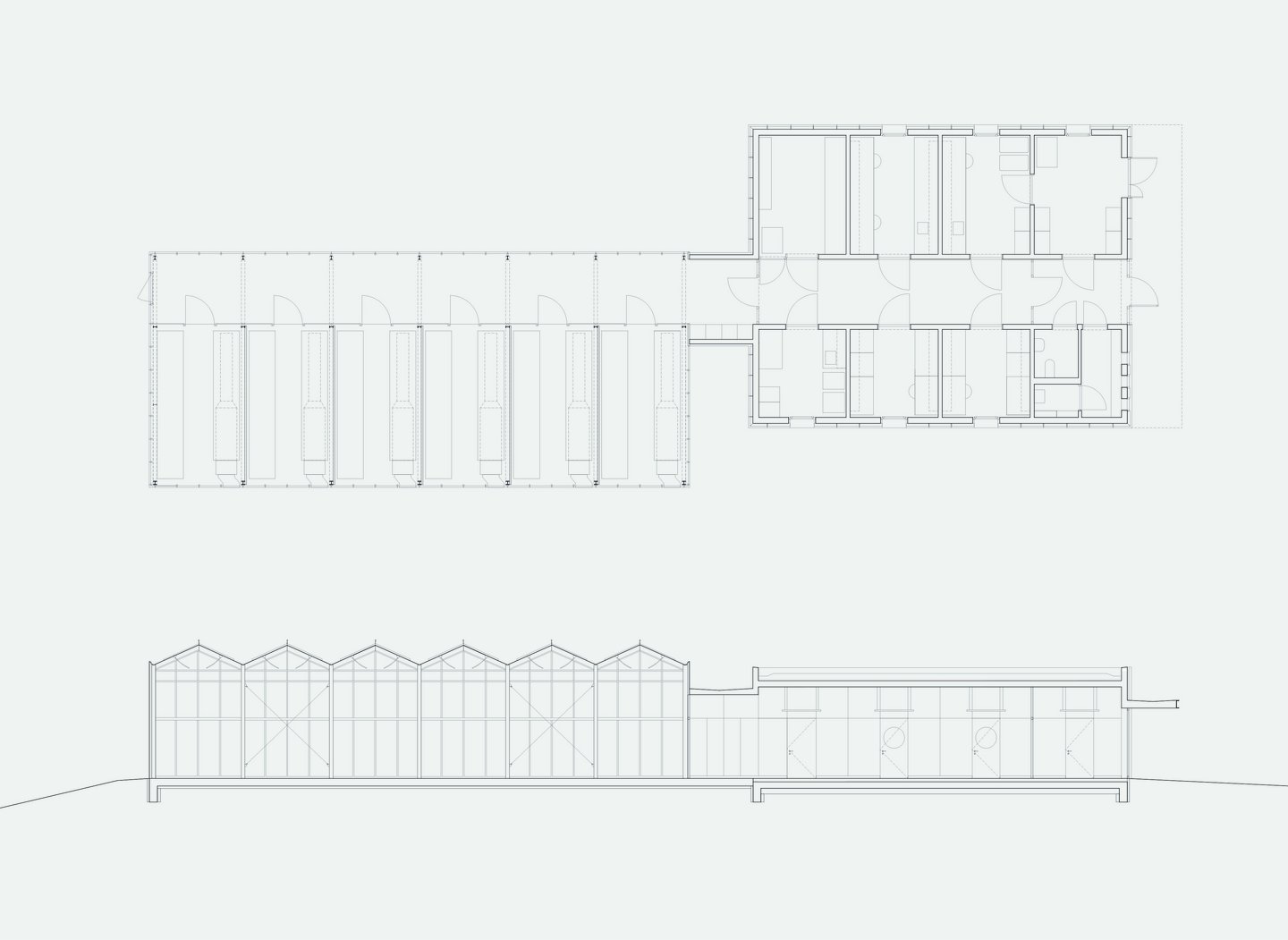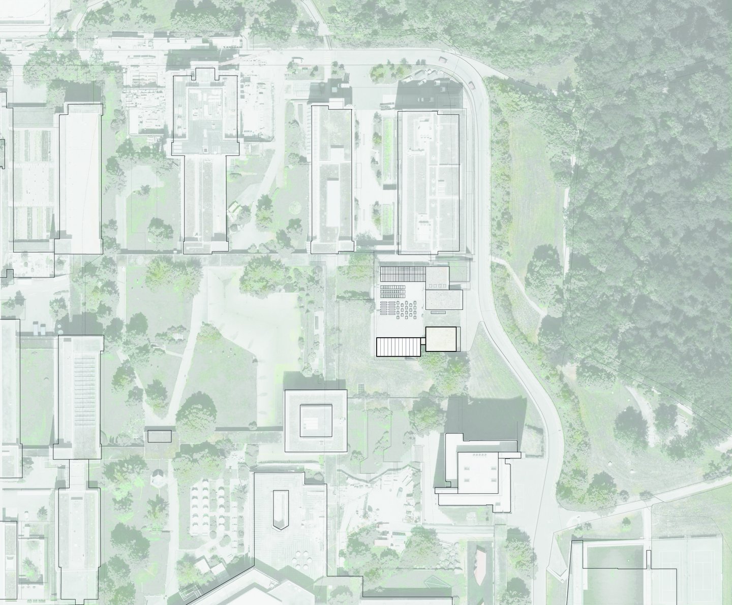Situation: durchgrünte Stadt / Der ursprüngliche Entwurf von 1959 für das Hochschulgebiet auf dem Hönggerberg von A. H. Steiner und Willi Neukom und deren zeittypischen Merkmale der «durchgrünten Stadt» sind trotz mehrfacher Erweiterung und Verdichtung über die Jahre nach wie vor sicht- und erlebbar: Ein von grün durchwachsener Campus deren Zwischenräume sich mit dem landschaftlichen Aspekt und dem bewaldeten Hönggerberg verzahnt, bilden die Grundlage, welche auch durch den Masterplan 2040 nach wie vor Gültigkeit hat. Die fingerartigen Grünräume, sowie die Durchblicke in Ost-Westrichtung sollen mit dem Neubau erhalten bleiben. Dieser orientiert sich typologisch am bestehenden Gewächshaus und schafft einen ungleichen Zwilling: Der längliche Baukörper schiebt sich so weit als möglich nach Süden um in Ostwestrichtung die Verzahnung mit dem Landschaftsaum zu erhalten. Parallel zum bestehenden gläsernen Gewächshaus im eigentlichen Grün- und Gartenbereich ist das transparente Gewächshaus vorgesehen, entlang der Strasse abgesetzt der Laborbau mit der Adressierung.