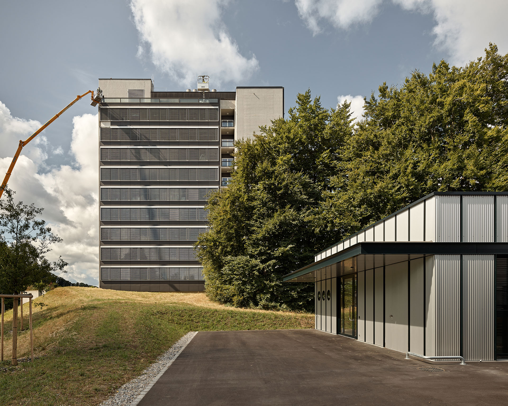 Situation: durchgrünte Stadt / Der ursprüngliche Entwurf von 1959 für das Hochschulgebiet auf dem Hönggerberg von A. H. Steiner und Willi Neukom und deren zeittypischen Merkmale der «durchgrünten Stadt» sind trotz mehrfacher Erweiterung und Verdichtung über die Jahre nach wie vor sicht- und erlebbar: Ein von grün durchwachsener Campus deren Zwischenräume sich mit dem landschaftlichen Aspekt und dem bewaldeten Hönggerberg verzahnt, bilden die Grundlage, welche auch durch den Masterplan 2040 nach wie vor Gültigkeit hat. Die fingerartigen Grünräume, sowie die Durchblicke in Ost-Westrichtung sollen mit dem Neubau erhalten bleiben. Dieser orientiert sich typologisch am bestehenden Gewächshaus und schafft einen ungleichen Zwilling: Der längliche Baukörper schiebt sich so weit als möglich nach Süden um in Ostwestrichtung die Verzahnung mit dem Landschaftsaum zu erhalten. Parallel zum bestehenden gläsernen Gewächshaus im eigentlichen Grün- und Gartenbereich ist das transparente Gewächshaus vorgesehen, entlang der Strasse abgesetzt der Laborbau mit der Adressierung.